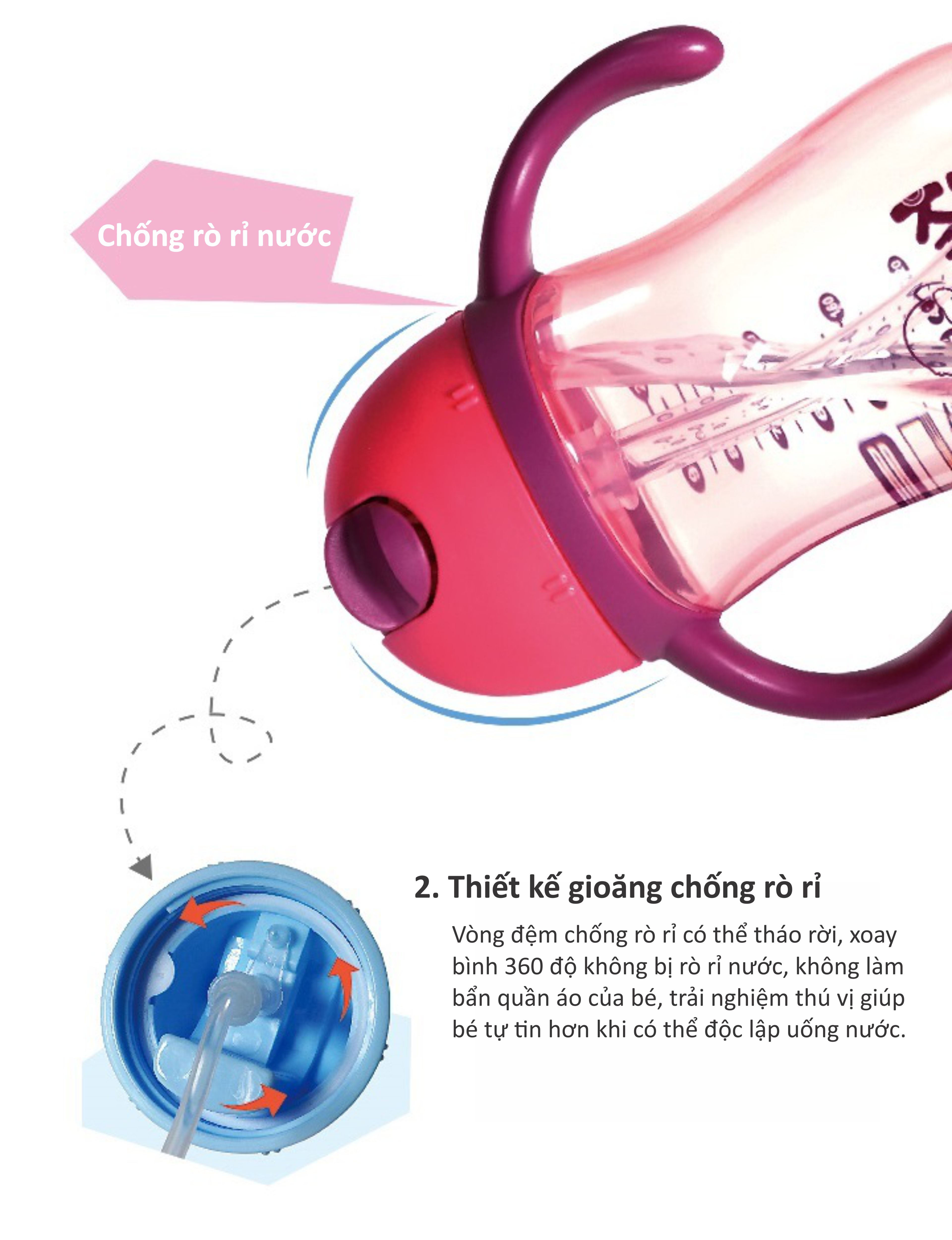 Ống hút cong để bé có thể uống đến giọt cuối cùng thiết ké van chống rồ rỉ và nắp lật mở giúp tránh bị rò rỉ nước ít phụ kiện dễ lắp ráp vả