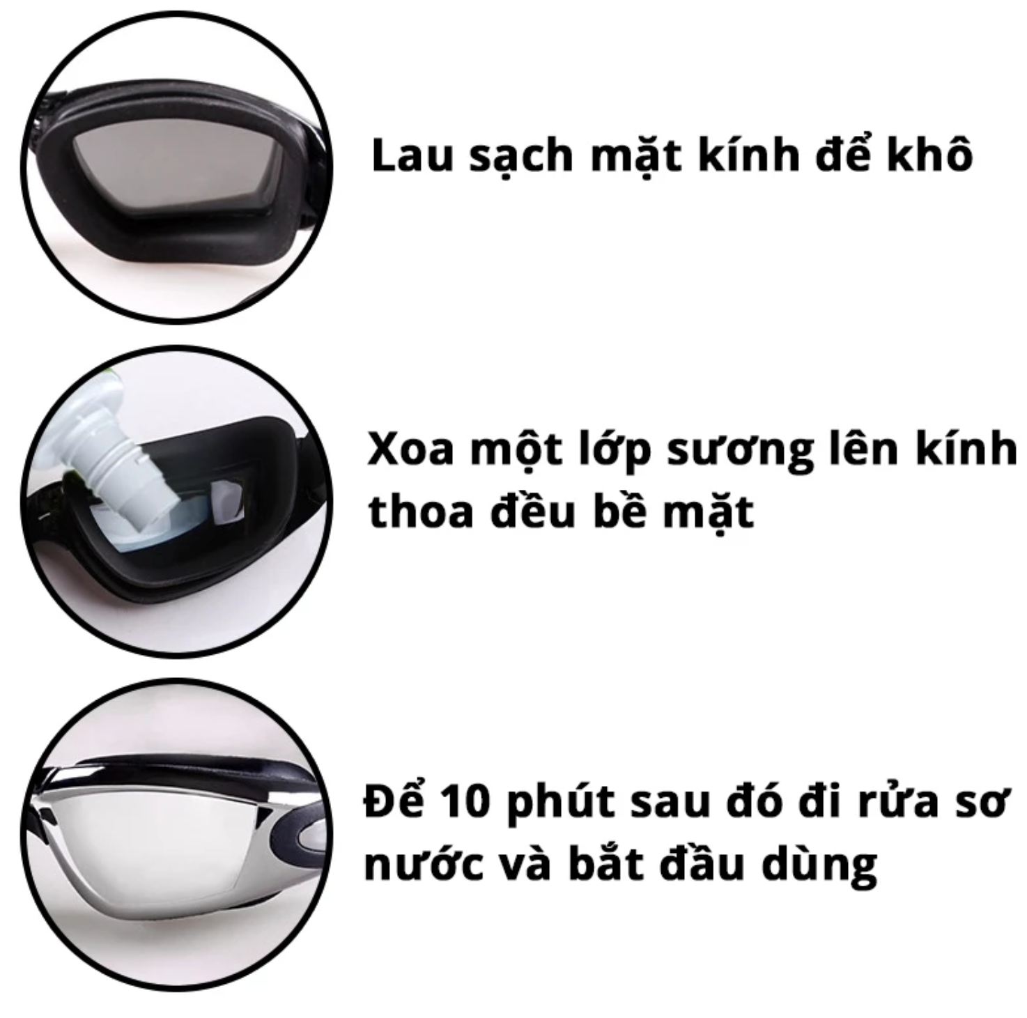 - Sản phẩm phù hợp với với các loại mắt kính ( Kính bơi, kính lặn,mặt nạ lặn, kính xe đạp...) và chống SƯƠNG MỞ kính các loại xe di chuyển trên khu vực miền núi, vùng cao, khu có nhiều mây, mưa, có không khí lạnh,... HƯỚNG DẪN SỬ DỤNG Dung Dịch Chống Sương Mờ