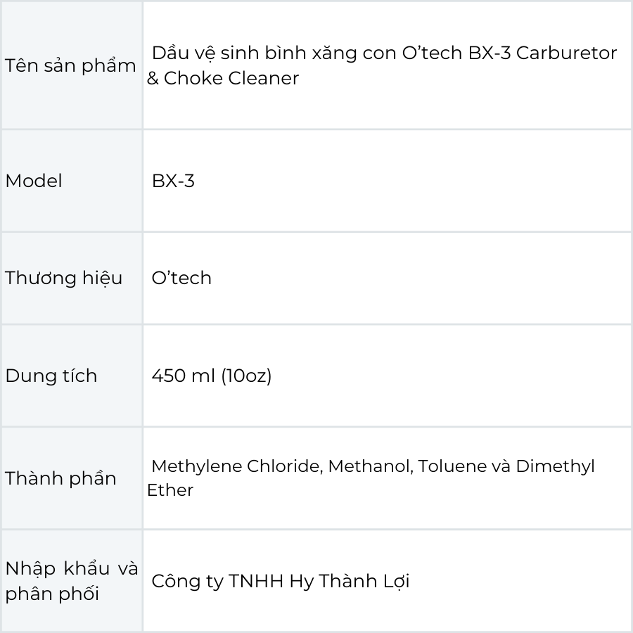 Mua tại TiktokBình xịt dầu vệ sinh bình xăng con O’tech BX-3 TÍNH NĂNG Bình xịt dầu vệ sinh bình xăng con BX-3 là một dung môi cực mạnh cho phép bạn làm sạch bộ chế hòa khí mà không cần tháo dỡ ra. Đơn giản chỉ cần xịt nó vào lỗ thông hơi của buồng phao để làm sạch bụi bẩn, cặn caron bên trong và xuống cổ họng một cách nhanh chóng và hiệu quả. Song song có thể xịt lên bên ngoài để làm sạch bên ngoài. Được dùng cho các xe máy, mô tô, ô tô, động cơ, thiết bị tàu thuyền, hàng không, cơ khí, thiết bị công nghiệp,… Ngoài ra bình xịt BX-3 còn dùng để vệ sinh dầu nhớt bám lâu ngày, vệ sinh sên, dùng được cho sên có phốt cao su. THÀNH PHẦN VÀ CÔNG DỤNG BÌNH XỊT VỆ SINH BÌNH XĂNG CON Dầu vệ sinh bình xăng con O’tech BX-3 với các thành phần như DICHLOROMETHANE (METHYLENE CHLORIDE), METHYL ALCOHOL (METHANOL), METHYLBENZENE (TOLUENE), DIMETHYL ETHER. Mang lại nhiều lợi ích trong việc bảo dưỡng và tối ưu hóa hiệu suất của động cơ. Dưới đây là một số lợi ích cụ thể từng thành phần mang lại: