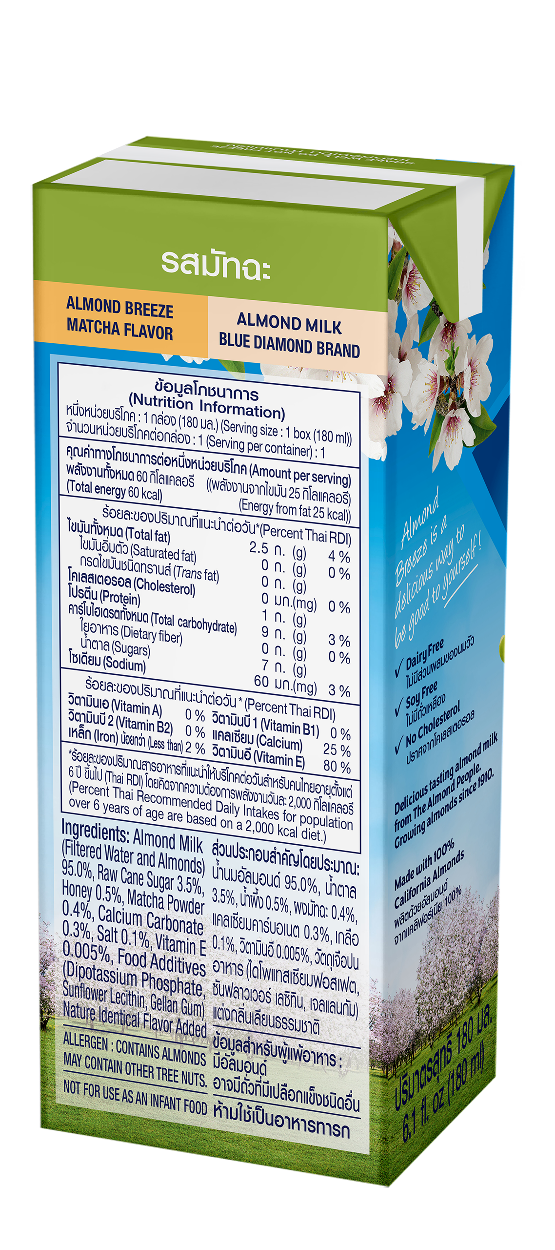 ALMOND BREZZE tự hào là sản phẩm sữa hạt hạnh nhân có SẢN LƯỢNG TIÊU THỤ SỐ 1 TẠI MỸ và vinh dự là SẢN PHẨM SỮA HẠT DUY NHẤT được phục vụ trong bữa chính TRÊN CHUYẾN BAY KHAI TRƯƠNG TRỰC TIẾP ĐẦU TIÊN VN98 TỪ VIỆT NAM SANG MỸ. Sự kết hợp độc đáo từ bột trà xanh nguyên chất của Nhật Bản và hạnh nhân tươi từ Mỹ đã tạo nên ALMOND BREEZE MATCHA giàu chất xơ, diệp lục tố và vitamin. Sữa hạt hạnh nhân ALMOND BREEZE (Sản phẩm của Tập đoàn BLUE DIAMOND – Mỹ) là thức uống bổ dưỡng hàng ngày tốt cho sức khỏe. Đặc biệt THÍCH HỢP VỚI KHÁCH HÀNG BỊ DỊ ỨNG VÀ KHÔNG DUNG NẠP ĐƯỢC ĐƯỜNG SỮA (Lactose); những người ăn chay; phụ nữ mang thai và cho con bú với thành phần dưỡng chất giàu Canxi và Vitamin E; không Cholesterol và không chứa các thành phần từ đậu nành và sữa. Chiết xuất hạnh nhân lên đến 94% ALMOND BREEZE MATCHA giúp bạn cảm nhận trọn vẹn tinh túy chất lượng hạnh nhân từ Mỹ. Sữa hạt hạnh nhân ALMOND BREEZE là sản phẩm sữa hạt tốt cho sức khỏe của bạn và gia đình bạn vì: