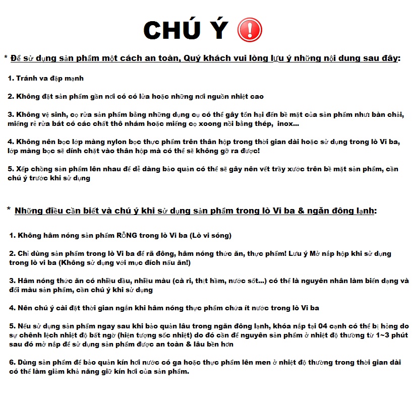 • Lưu ý: Mở nắp hộp khi sử dụng trong lò vi sóng!