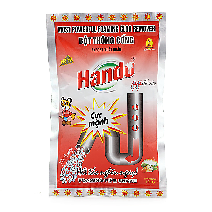 - Bột thông cống Hando 100g xuất khẩu với công thức tiên tiến, các thành phần hóa học chuyên dụng, độ tẩy cực mạnh sẽ xoáy tan mọi cặn bẩn trong đường ống một cách hiệu quả.