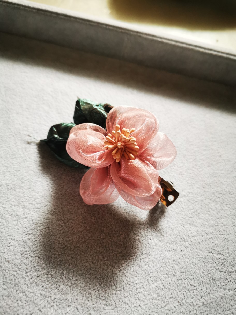 Trang trí hoa xinh xắn, thiết kế dạng bấm tạo sự độc đáo riêng cho mái tóc, nét duyên dáng gọn gàng, tô điểm cho mái tóc của bạn gái.