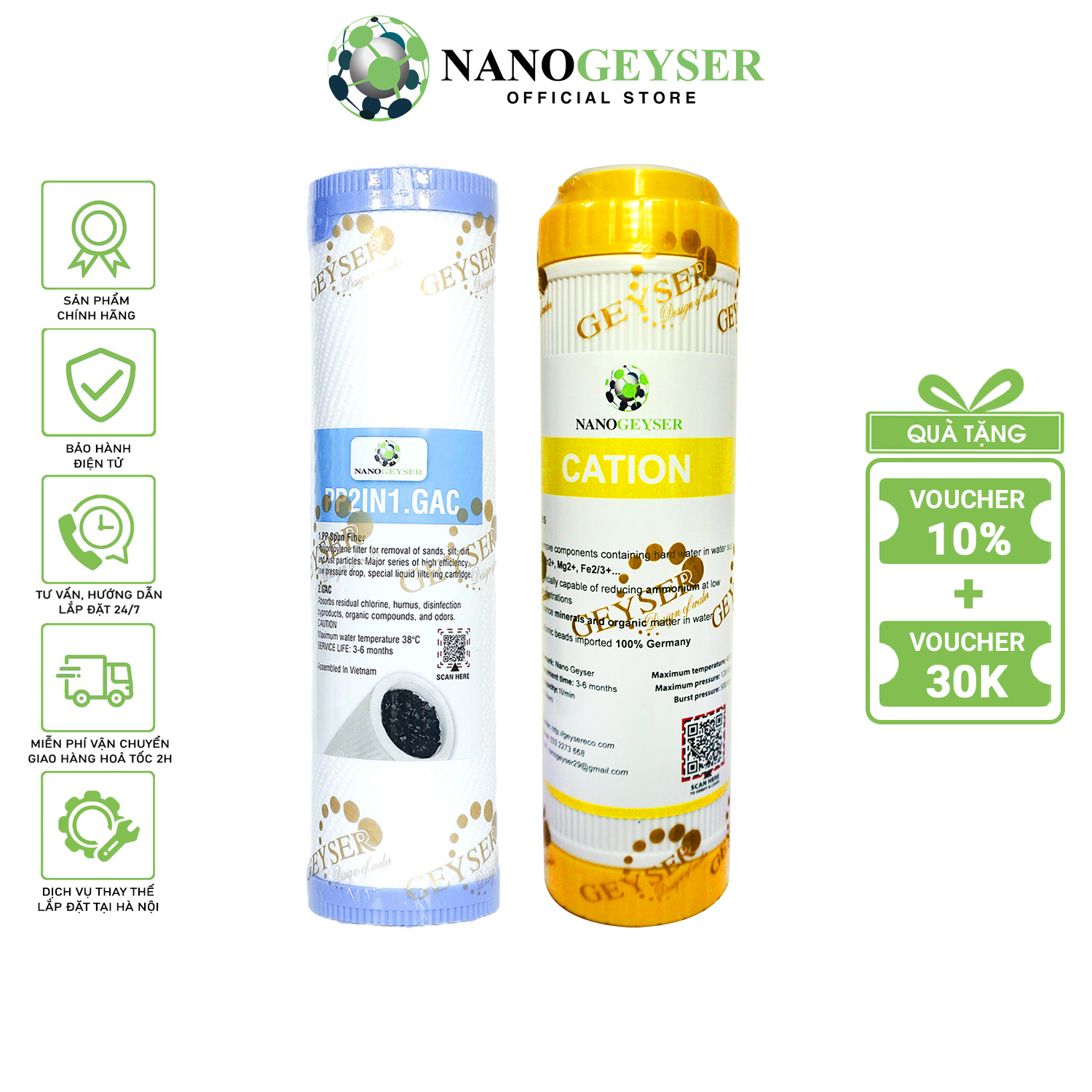 Mua tại TiktokBộ 2 lõi lọc nước 12 dành cho máy lọc NANO và UF – Lõi PP.2IN1.GAC & Lõi Cation Nano Geyser