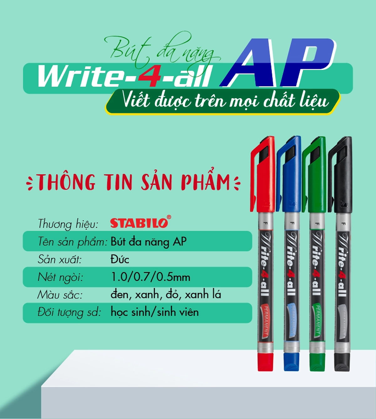 ✨Bộ 4 Bút kỹ thuật STABILO Write-4-all PERMANENT xanh + đen + đỏ + xanh lá (AP-C4) - 1.0 mm