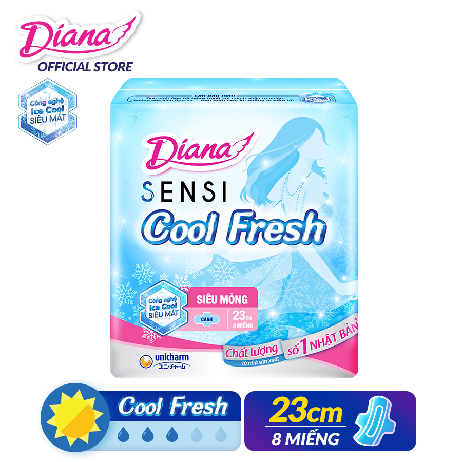 Băng vệ sinh Diana Sensi Cool Fresh Mát Dịu Siêu Mỏng Cánh 8 miếng - Chiết xuất hoa cúc la mã <> mang đến cảm giác mát nhẹ dịu và kiểm soát mùi hiệu quả