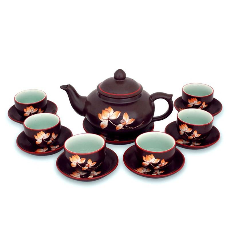 Bộ sản phẩm bao gồm: 1 ấm trà, 1 đĩa ấm, 6 chén trà, 6 đĩa chén Hoa sen là biểu tưởng đẹp về đức tính con người Việt: mạnh mẽ vươn lên, không