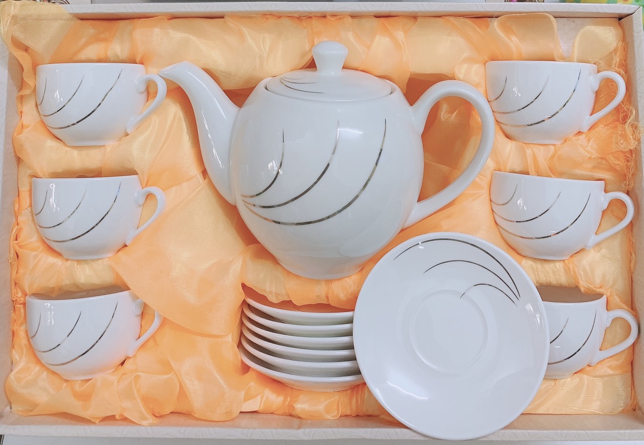 Một bộ sản phẩm bao gồm: 01 ấm, 01 đĩa ấm, 06 chén và 06 đĩa chén. Bộ sản phẩm được làm từ chất liệu gốm cao cấp, bảo đảm an toàn vệ sinh