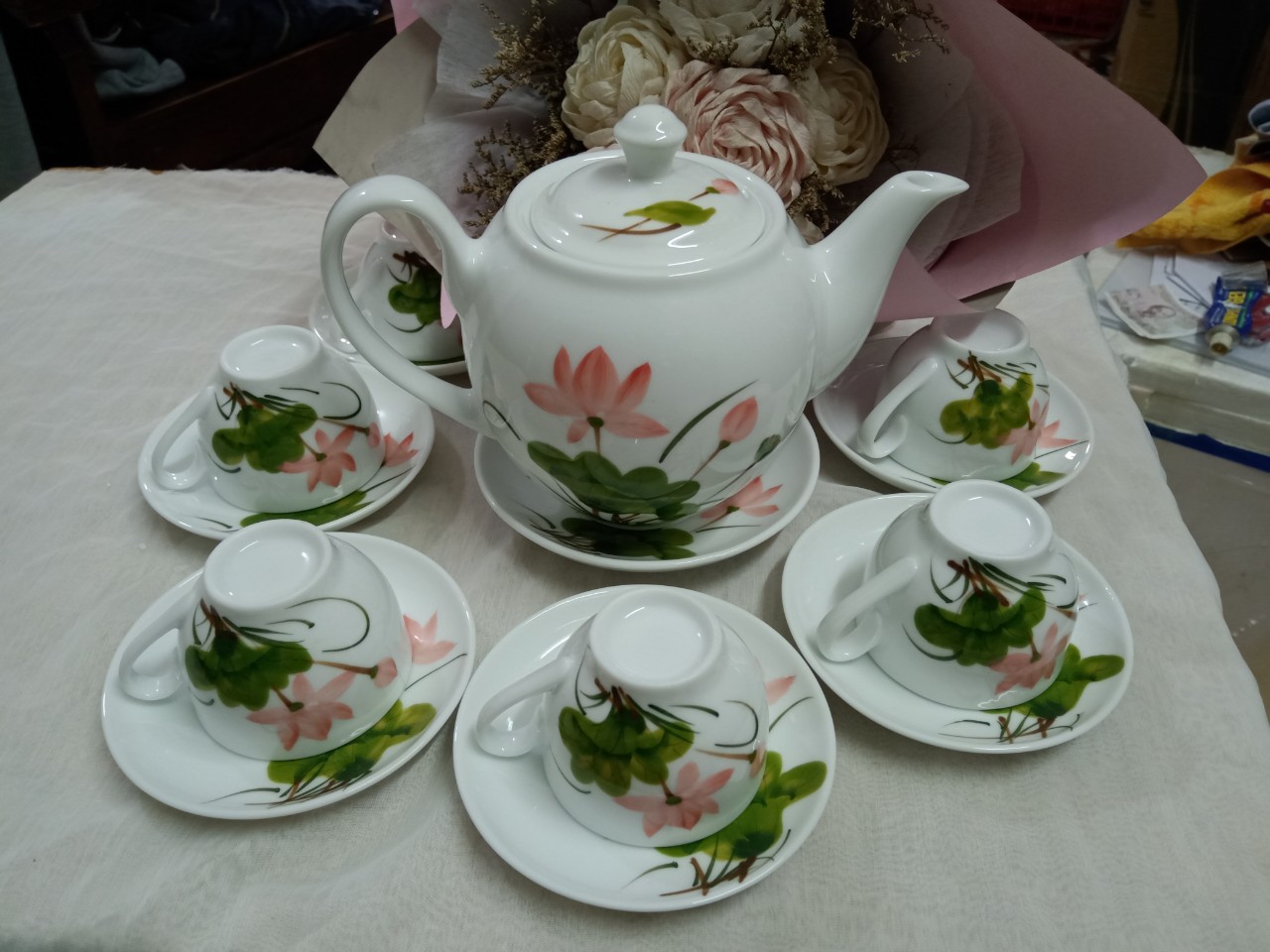 ✨Bộ ấm chén vẽ sen gốm sứ Bát Tràng