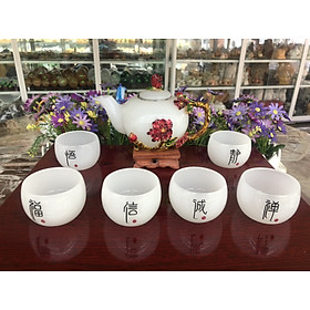 Chất liệu: Đá bạch ngọc Bao gồm: 01 ấm; 06 chén, 1 tách đựng nước thừa và hộp đựng cao cấp Kích thước : Dài 36 cm x 25 cm x 13 cm ( Bao