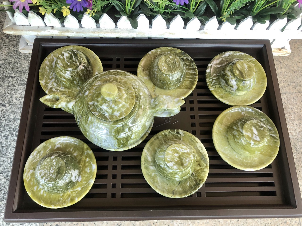 Chất liệu: Đá ngọc Serpentine Bộ sản phẩm gồm: 7 dĩa, 6 ly và 1 ấm trà Dùng để uống trà hoặc làm quà biếu tặ