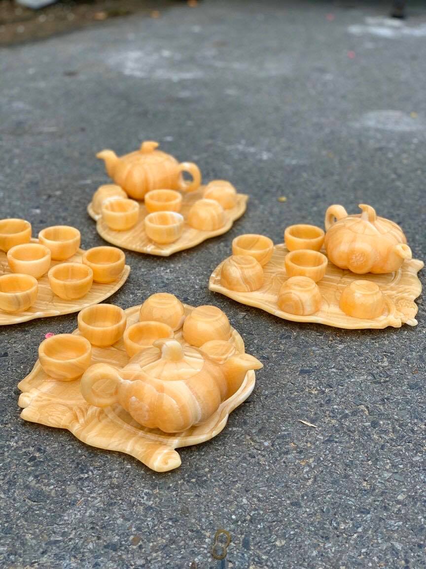 Chất liệu: Đá ngọc hoàng long Mô tả: Dĩa làm kiểu lá bí; Ấm trà kiểu bí ngô Bộ sản phẩm gồm: Ấm trà, 6 ly và 1 dĩa
