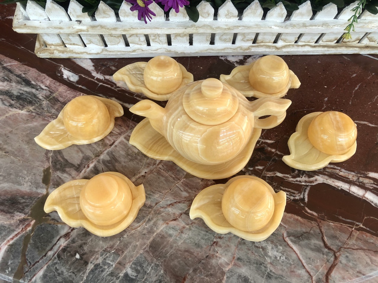 Chất liệu: Đá ngọc Onyx Bộ sản phẩm gồm: 7 dĩa, 6 ly và 1 ấm trà Khối lượng: 1,5 kg Sử dụng làm vật phẩm trang trí nhà cửa, quà biếu hoặc có thể