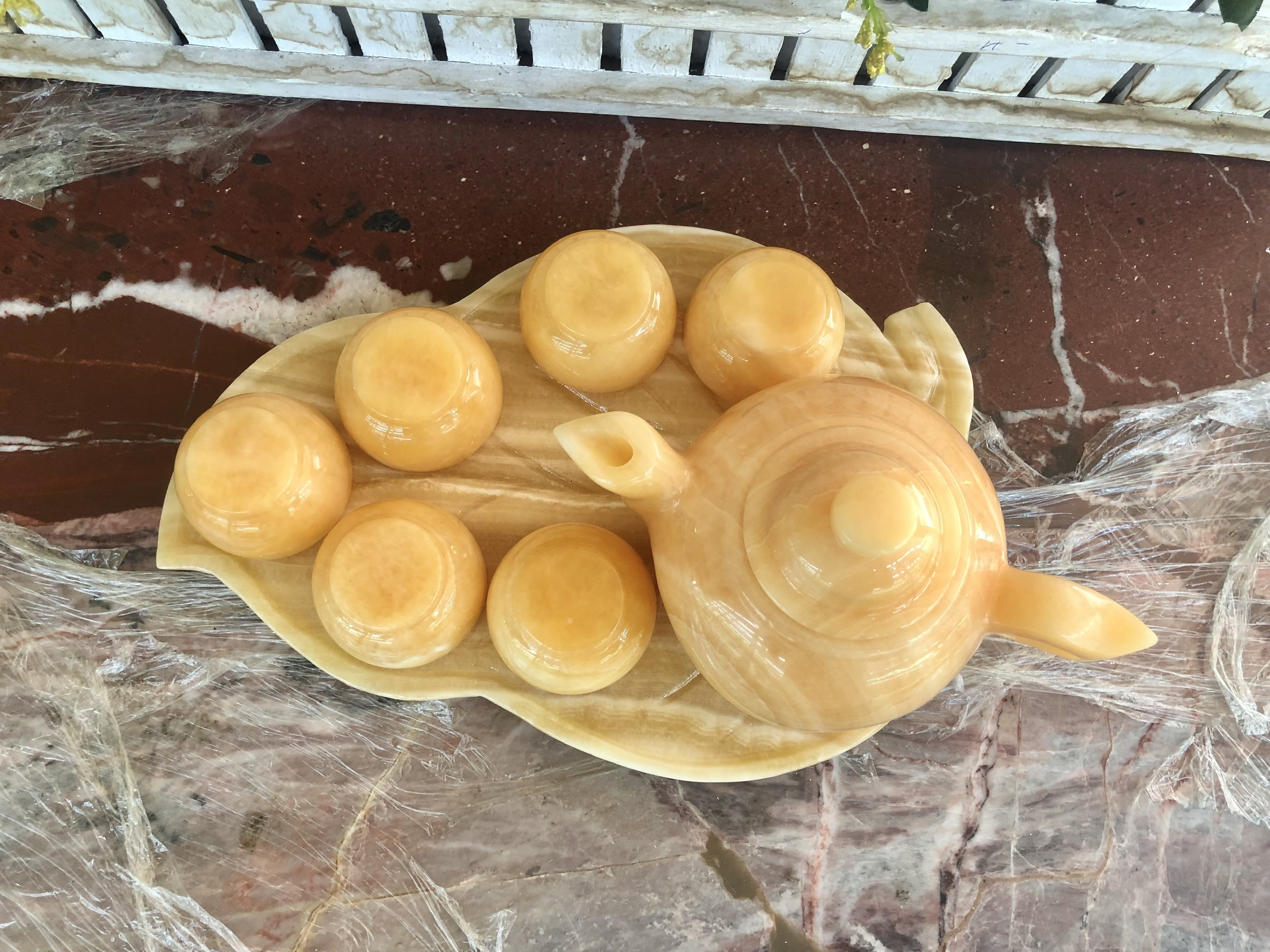 Chất liệu: Đá ngọc Onyx Bộ sản phẩm gồm: 7 dĩa, 6 ly và 1 ấm trà Khối lượng: 1,5 kg Sử dụng làm vật phẩm trang trí nhà cửa, quà biếu hoặc có thể