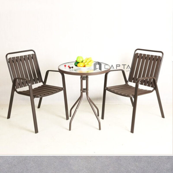 - Phù hợp bàn ghế ban công, sân vườn, cafe nhà hàng rooftop sân thượng,… Một gợi ý đến từ Nội Thất Capta dành cho bạn nếu đang tìm kiếm bàn ghế ngoài trời giá rẻ bền đẹp. Bộ bàn cafe mặt kính 2 ghế outdoor dùng cho sân vườn, ban công, sân thượng, hồ bơi,… Sản phẩm SL TE2020-06G / CC2032-T sử dụng chất liệu chuyên dụng ngoài trời, chịu được nắng mưa mà không cần lo ngại ảnh hưởng đến chất lượng sản phẩm. Sau đây là thông tin chi tiết bộ bàn ghế. Bàn cafe ngoài trời mặt kính nhập khẩu TE2020-06G Bàn cafe TE2020-06G nhỏ gọn, thiết kế đơn giản. Bàn khung sắt sơn tĩnh điện màu đen / nâu vững chắc. Mặt bàn kính cường lực 60 cm tạo chiều sâu không gian. Chất liệu kính và sắt sử dụng thoải mái môi trường ngoài trời mà không lo ngại gỉ sét. Viền mặt bàn bằng sắt dày giúp cố định và bảo vệ an toàn cho mặt kính. Thiết kế bốn chân bàn kiểu dáng độc đáo, tạo điểm nhấn thu hút. Các chân bàn được nối với nhau nhờ hai vòng tròn / vuông cố định bằng ốc gia tăng độ vững ổn tổng thể. Ghế cafe outdoor có tay xếp chồng gọn nhẹ CC2032-T Ghế outdoor CC2032-T mặt ngồi và lưng tựa nhựa PP (polypropylene) vân gỗ đẹp mắt. Nhựa PP không chỉ nhẹ, dễ vận chuyển, chống nước nên thuận tiện vệ sinh. Mẫu ghế CC2032-T khung ghế sắt bạn có thể hoàn toàn an tâm về khả năng chống gỉ sét nhờ lớp phủ epoxy. Chắc hẳn đa số chúng ta chưa nắm rõ về khái niệm Epoxy là gì. Hãy để Capta giải thích rõ hơn về nó nhé! Sơn phủ Epoxy là gì? Sơn phủ Epoxy là lớp sơn bao gồm hai thành phần được kết hợp bởi ba chất hóa học: Epichlorohydrin, Bisphenol-A cùng Polymide. Chúng được ứng dụng cho sản phẩm sử dụng trong môi trường thời tiết khắc nghiệt. Ưu điểm sơn phủ Epoxy: Sơn phủ Epoxy có độ bám dính tốt trên bề mặt kim loại. Không bám bụi nên rất dễ vệ sinh. Khả năng chống thấm cao, chống ăn mòn tốt rất thích hợp với môi trường ngoài trời, gần biển,…