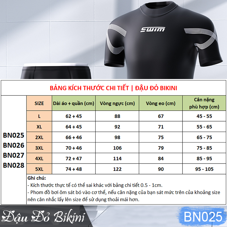 Bơi lội tự tin thỏa thích cùng bộ bơi nam tính, phom big size rộng rãi BN060 Bảng size tham khảo: Giới thiệu sản phẩm: - Áo thun bơi cộc tay che nắng tốt mà