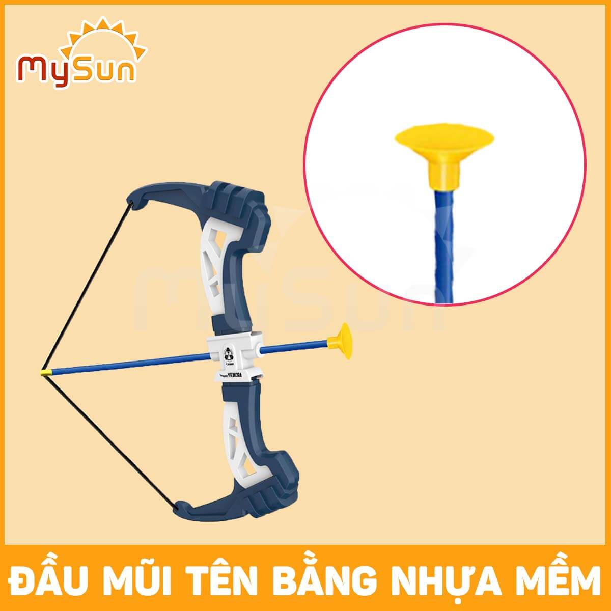 - Cây cung đồ chơi được làm bằng nhựa, mũi được thiết kế cốc nhựa hít tường an toàn.