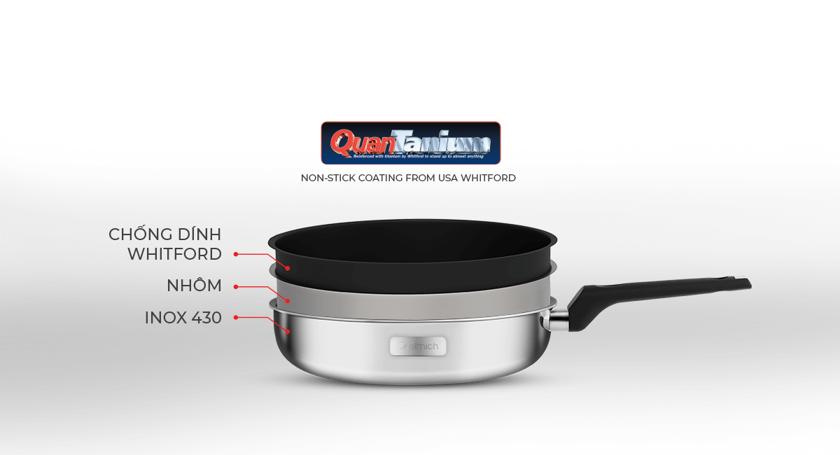 Lòng chảo được phủ chống dính 3 lớp Whitford Quantanium màu đen ánh kim cho độ bền bỉ tối ưu. Đây là loại chống dính tuyệt đối an toàn cho sức khỏe, không chứa các chất có hại như PFOA, APEO. Chống dính Whitford đạt tiêu chuẩn FDA của Mỹ và được sử dụng trên toàn thế giới.