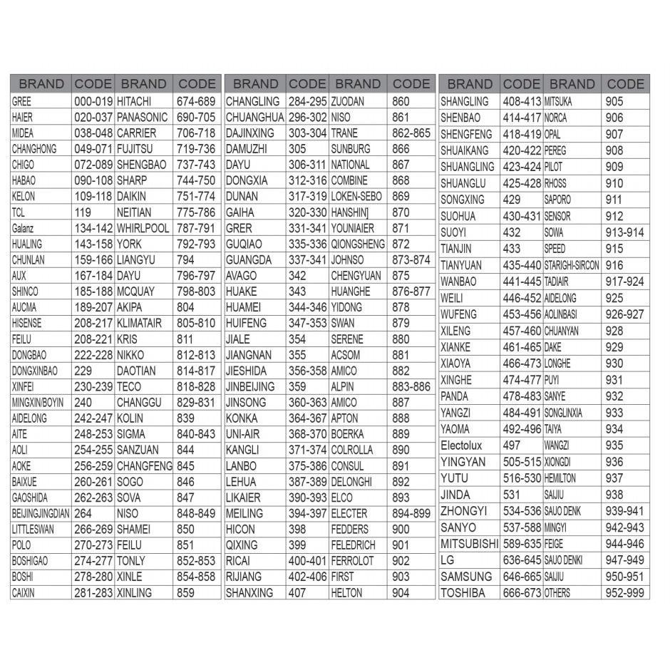 Thông số kỹ thuật: Tần số của các loại máy Nhãn hiệu - Tần số cho Haier - 20-37 cho Daikin - 751-774 cho Electrolux - 497 cho Fujisu - 719-736 cho Gree - 0-19 cho Hitachi - 674-689 cho LG - 636-645 cho Mítubishi - 589-635 cho Panasonic 690-705 cho Samsung - 646-665 cho Sanyo - 537-588 cho Sharp - 744-750 cho TCL - 119 cho Toshiba - 666-673