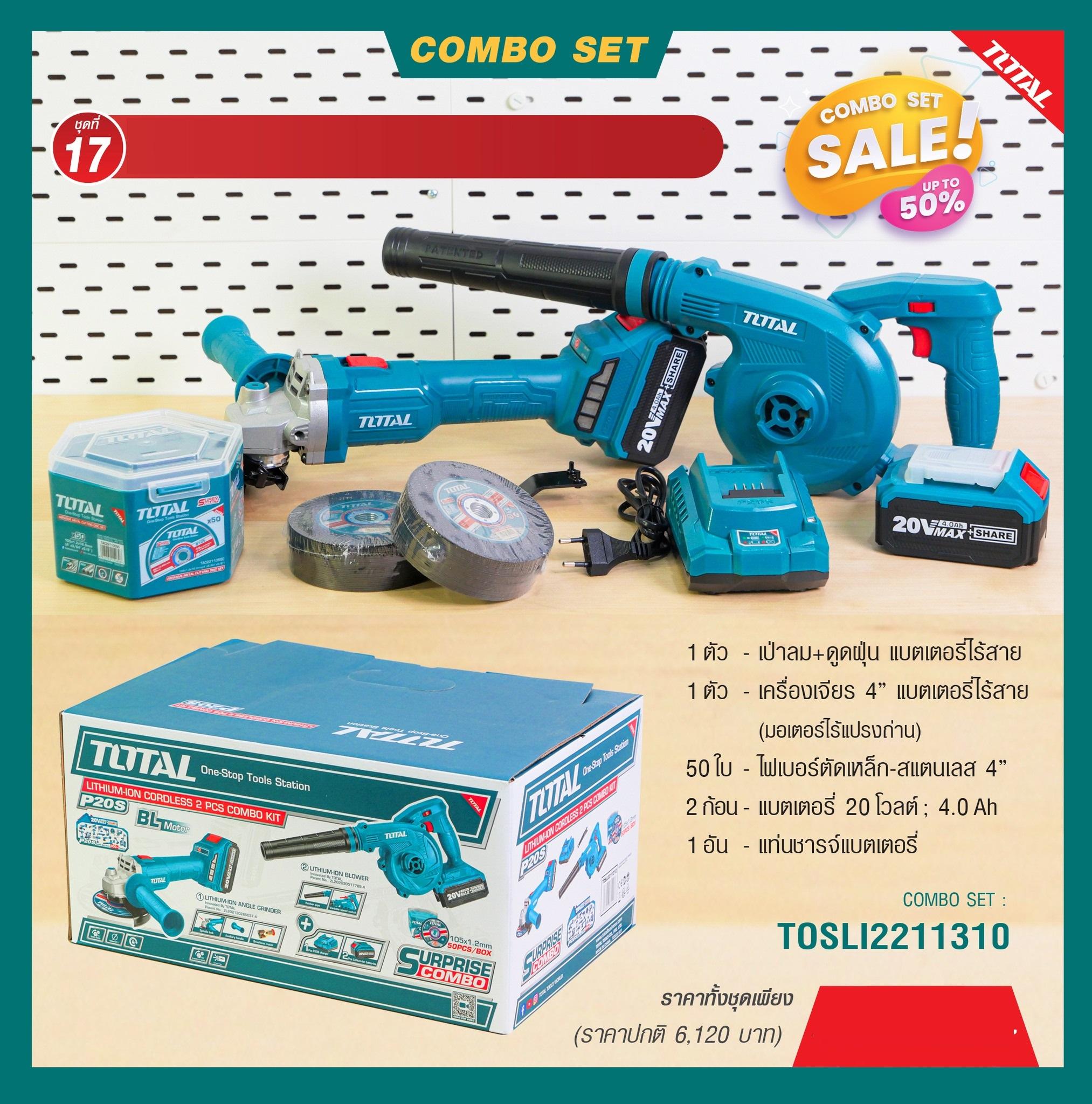 Thông số kĩ thuật -Mã sản phẩm TOSLI2211310 -Xuất xứ Trung Quốc -Thương hiệu Total -Phụ kiện Gồm 1 máy mài góc pin 20V (TAGLI20107) và 1 máy thổi bụi 20V (TABLI20018). -Phụ kiện Gồm 2 pin 4.0Ah và 1 sạc Điện áp sạc: 220-240V~50/60Hz Kèm 50 đĩa cắt kim loại TAC22110550 -Bảo hành: 6 tháng