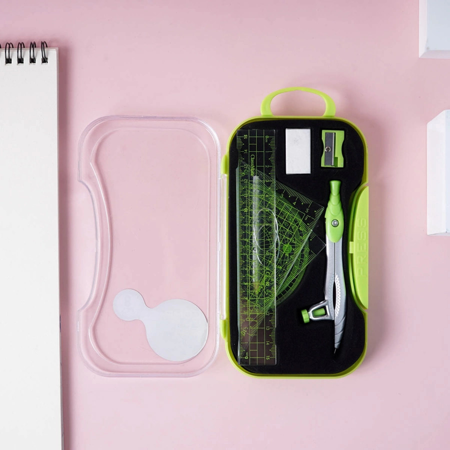 • Chất Lượng Cao Cấp: Bề mặt compa được sơn kim loại cao cấp, đảm bảo độ bền và chống gỉ sét. Các chi tiết như thước thẳng, eke và hộp đựng đều được sản xuất bằng nhựa chưa qua tái sử dụng, đảm bảo độ trong suốt tuyệt đối.