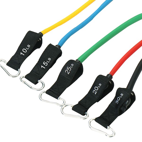Bộ dây đàn hồi tập thể lực có 5 dây, mỗi dây có mức trọng lượng khác nhau, từ nhẹ tới nặng (8 lbs, 15 lbs, 20 lbs, 25 lbs, 30 lbs) có thể