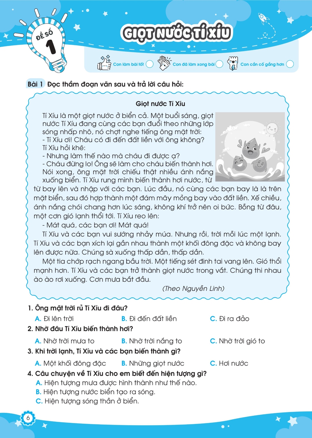 - Sách được chia thành 2 phần rất dễ hiểu cho các bé: Phần đề ôn tập và Phần đề kiểm tra. Phần đề ôn tập: Gồm 18 đề được chia theo các chủ điểm, hoặc chia thành các đề ôn tập theo sát chương trình học trên lớp theo giai đoạn. Phần đề kiểm tra: Gồm 5 đề kiểm tra cuối học kỳ để kiểm tra, đánh giá kiến thức tổng hợp của học sinh.