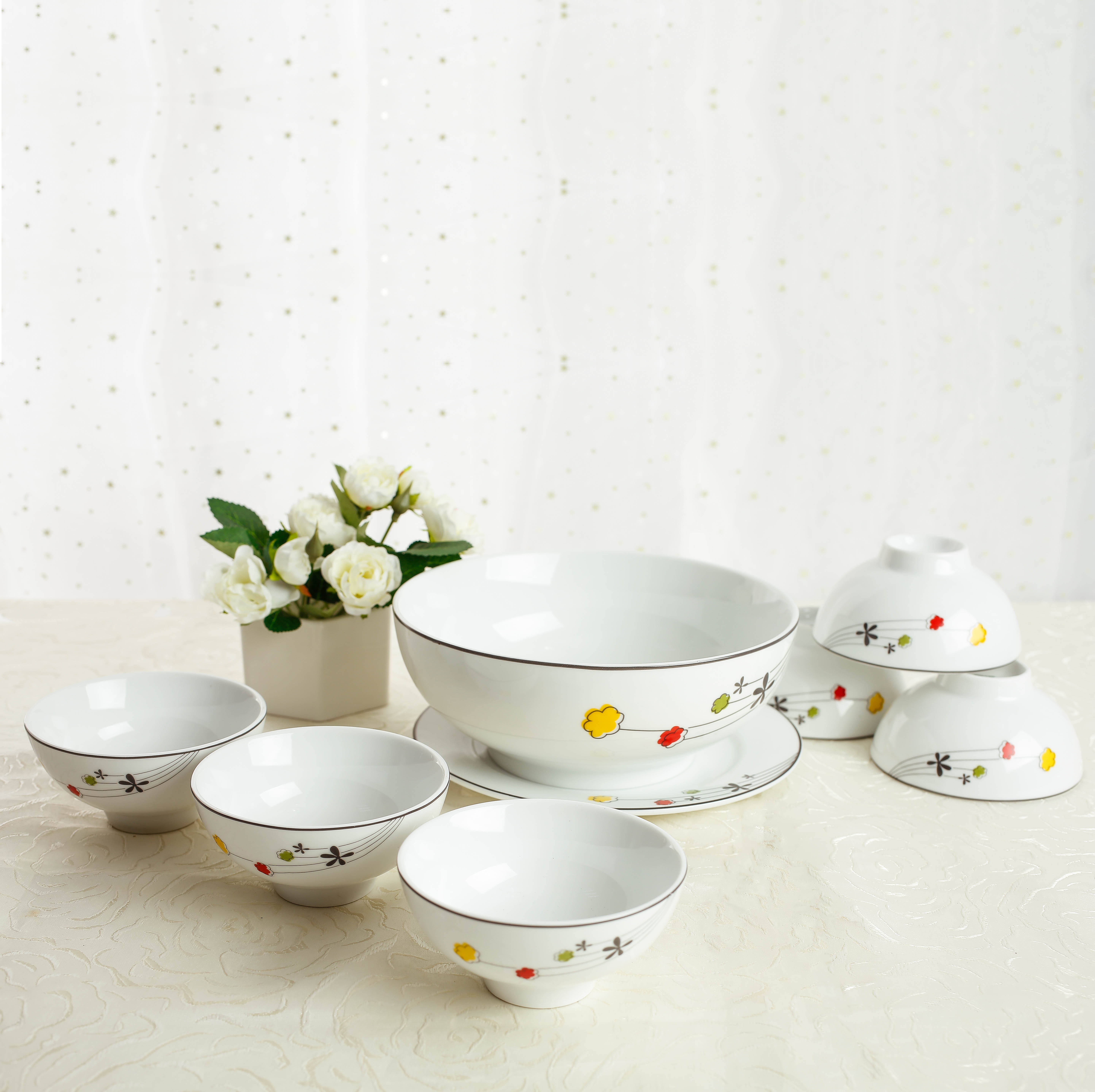 BỘ BÁT ĐĨA HOA MẶT TRỜI TRẮNG TÔ HOA 7 CHI TIẾT Gồm: -1 bát tô và 6 cánh đĩa (đường kính cả bộ 54cm) bát tô đường kính 20cm
