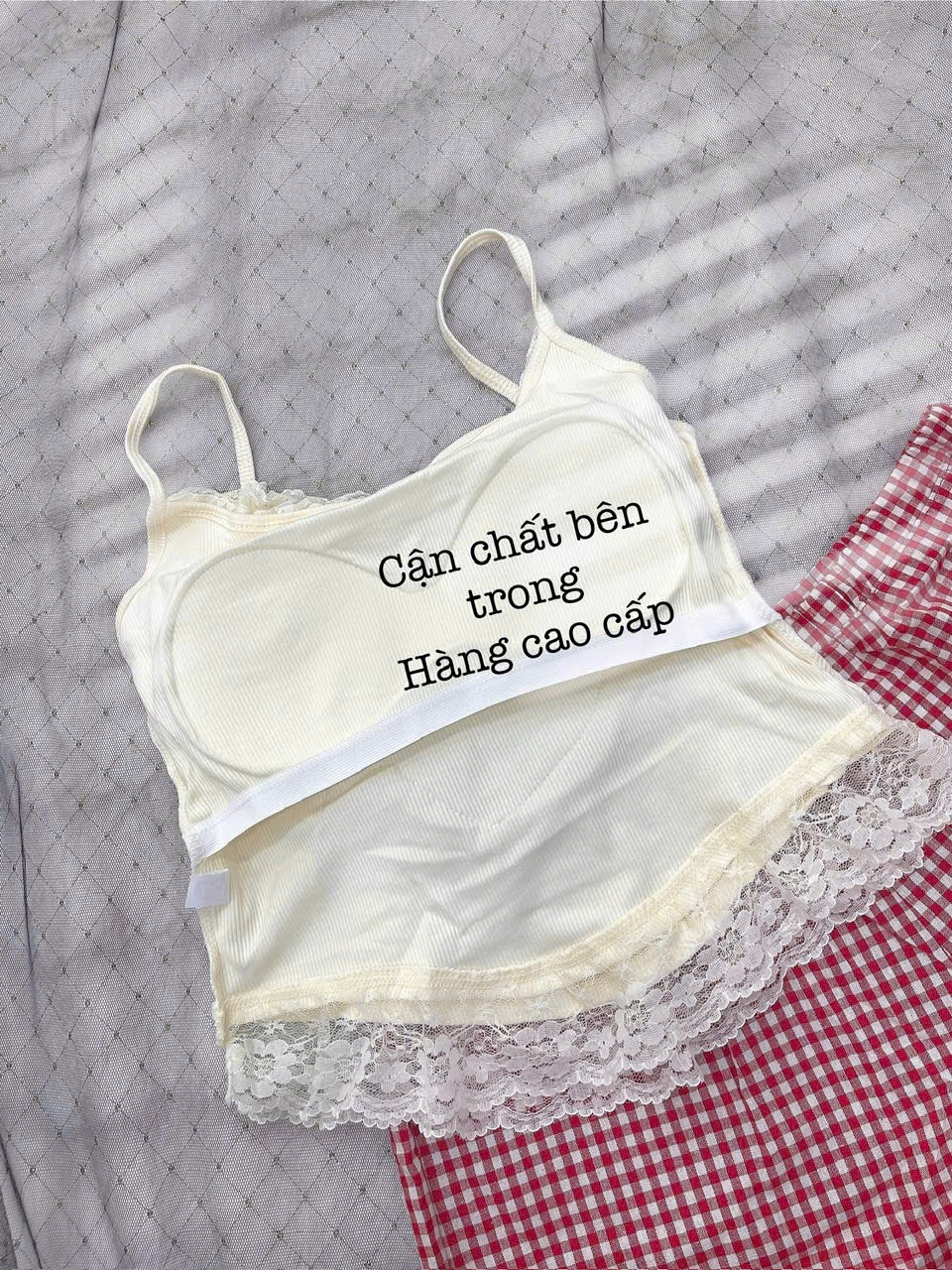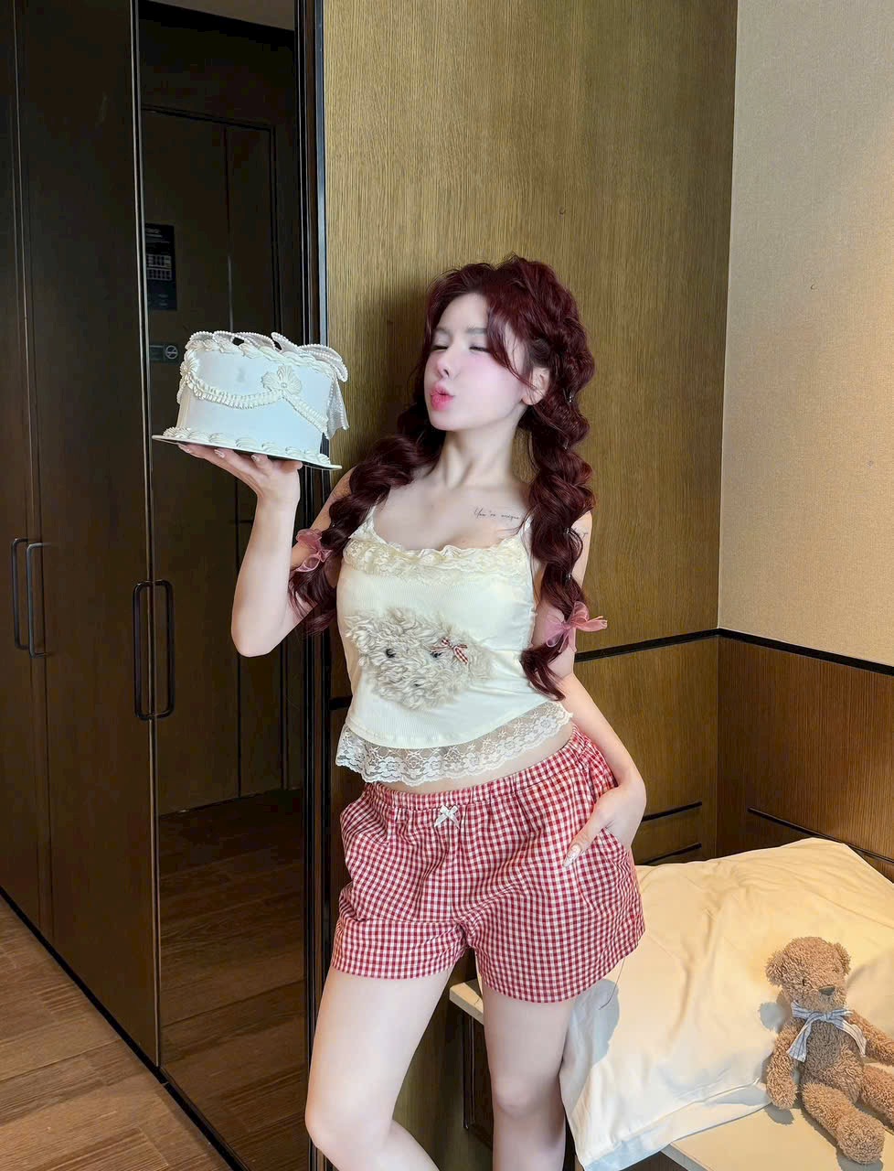 Đồ bộ mặc nhà lụa cao cấp WANNABE BSS39 đồ bộ quần sọt phối áo 2 dây lưng cut-out viền ren gợn sóng trẻ trung quyến rũ Đồ bộ mặc nhà phi lụa cao cấp