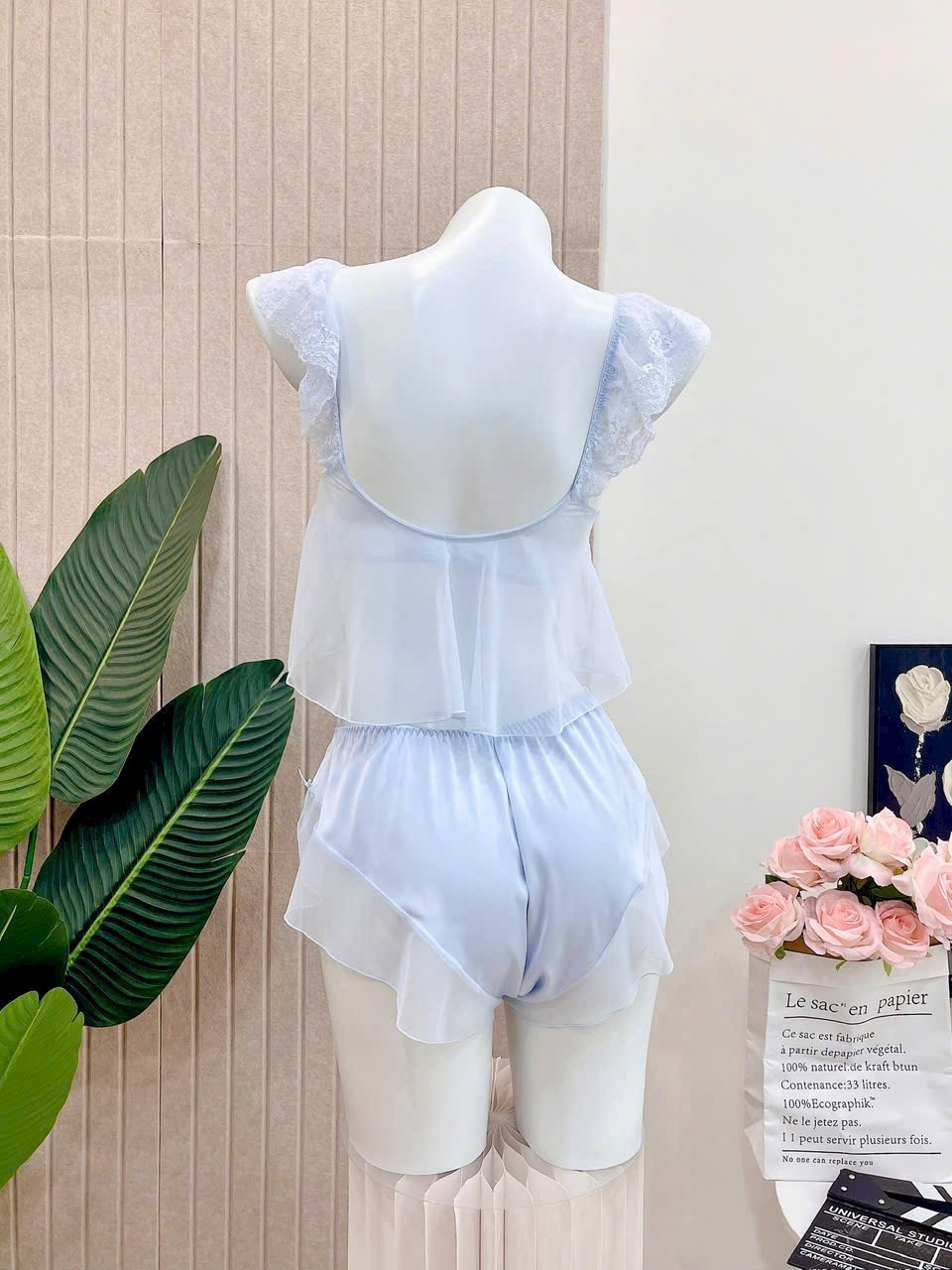 Bộ đồ ngủ hai dây lụa xanh dương nhạt với chi tiết ren quần cách điệu gợi cảm - Màu sắc: xanh dương nhạt - Chất liệu: lụa - Xuất xứ: toàn bộ sản phẩm