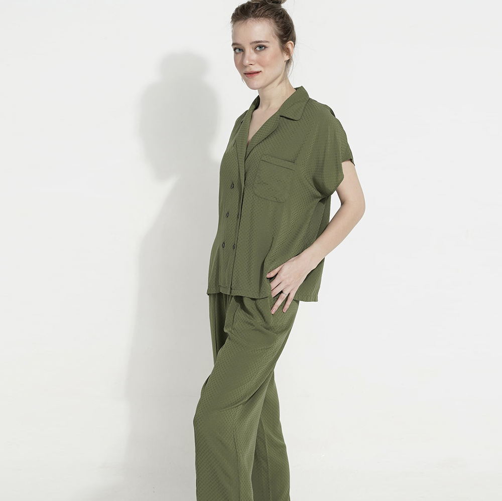 Pyjama mặc nhà màu nâu họa tiết chấm bi xanh - LA MỘC chất liệu vải SATIN LỤA. Thiết kế chú trọng từng đường may. Mang lại cảm giác thoải mái cho người mặc. Mang