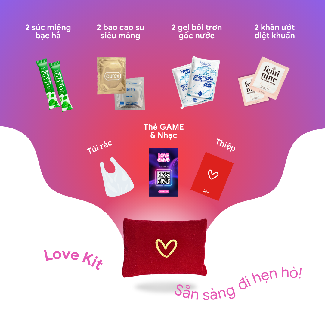 Love Kit là một ví nhung nhỏ gọn kích thước 12x8 cm, tiện lợi cho vào túi xách để đem đi khắp nơi như đi du lịch, đi hẹn hò, đi bar, cắm trại, Love Kit còn là món quà tặng thiết thực mà bố mẹ tặng cho con trong sinh nhật 18 tuổi. Ví chứa các vật dụng cần thiết cho câu chuyện tình yêu của bạn: 2 BCS siêu mỏng 2 Gói gel bôi trơn gốc nước 2 Khăn ướt vệ sinh 2 Nước súc miệng bạc hà 1 Thẻ Nhạc và Game "Ngọt ngào hay Nồng cháy" 1 Hướng dẫn sử dụng 1 Thiệp 1 Túi đựng rác 1 Ví nhung Vì sức khoẻ và sự an toàn của bạn, chúng tôi tuyển chọn các sản phẩm đạt tiêu chuẩn của BYT, có nguồn gốc và thương hiệu chính thống được đăng ký theo đúng quy định PL. Combo Bộ Du Lịch An Toàn - Safe Travel Set là sự kết hợp tuyệt vời giữa Túi sơ cứu cá nhân và LoveKit - Ví Tình Yêu, vừa giúp bảo vệ an toàn cho bản thân, vừa tạo thêm những trải nghiệm đặc biệt cho những chuyến du lịch cùng người yêu.
