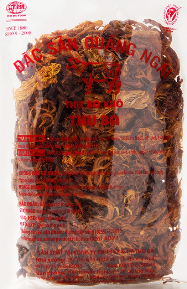 BÒ KHÔ THU BA là món đặc sản Quảng Ngãi, đạt tiêu chuẩn ISO 9001:2015 và là Hàng Việt Nam Chất Lượng Cao do Người tiêu dùng bình chọn 2017, 2018, 2019 và 2020
