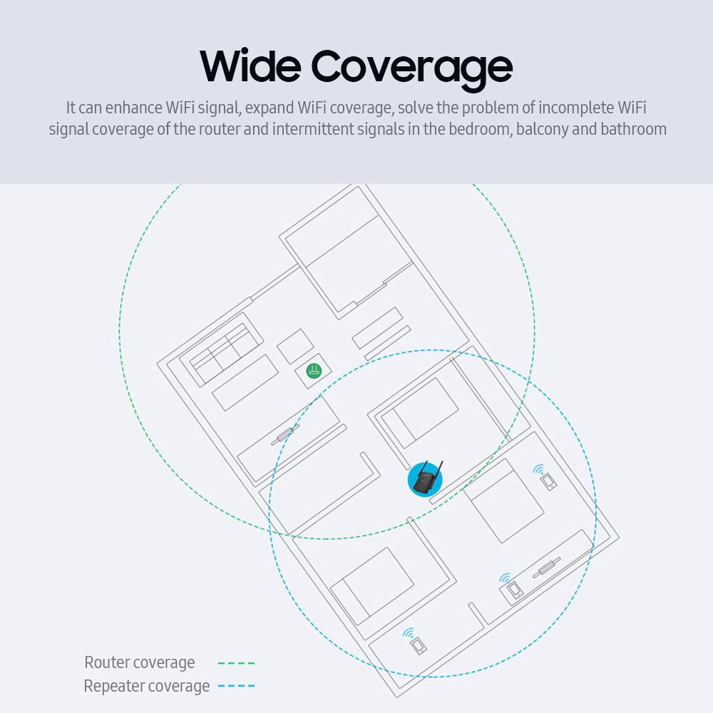 Features: It can enhance WiFi signal, expand WiFi coverage, solve the problem of incomplete WiFi signal coverage of the router and intermittent signals in the bedroom, balcony and bathroom. It provides up to 300Mbps WiFi