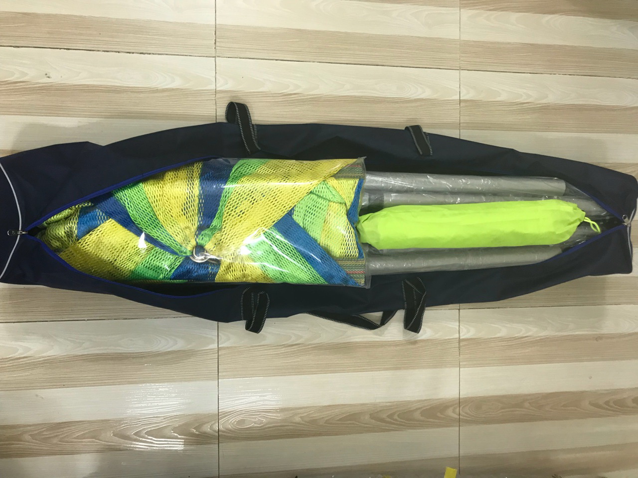 Bộ khung võng xếp p32 + dù che + võng lưới số 9.3 thép 60 (hàng tiêu chuẩn xuất khẩu Korea) Thông tin sản phẩm Chất liệu (dung sai +-5%) ·       Ống thép, sơn tĩnh điện (màu bạc hoặc màu sần) ·       Đường kính 32.0mm, chiều dày 0.7mm Mô tả chi tiết ·       Võng xếp gọn, cơ động, có thể xách tay & sử dụng mọi lúc, mọi nơi (tháo lắp chỉ 20 giây) ·       Đầu võng siêu bền nhờ 2 bạc đạn Nhật, giúp võng đu đưa lâu & nhẹ nhàng.  ·       Chốt gài có 3 rãnh là 3 mức điều chỉnh độ rộng của khung võng. ·       4 thanh chống thẳng: điều chỉnh độ dài & độ cao của khung võng. Trọng lượng  (dung sai +-5%) ·       Trọng lượng tịnh: 6.7kg ·       Trọng lượng bao bì: 7.3 kgs Kích thước (dung sai +-5%) ·       Kích thước sử dụng: 231 x 74.5 x 79.0 cm ·       Kích thước bao bì: 113 x 14.5 x 19.5 cm Chi tiết đóng gói ·       Túi xách vải bố, túi nylon   Võng lưới in sọc số 9.3, thép 60 Thông tin sản phẩm   Chất liệu Sợi 100% polyester Mô tả chi tiết Lỗ nhỏ, sợi lưới dày, chắc chắn, đã căng kim, ít giãn, khổ lưới rộng Các chi tiết phụ May lõi thép 60 bên trong 3 khoen móc võng để điều chỉnh chiều dài cho phù hợp Kích thước sử dụng (chiều dài phần lưới x chiều rộng) dung sai +-5% 180 x 142 cm Cân nặng (kgs), dung sai +- 5% 1.3 kgs (hàng xuất khẩu, tem Hàn Quốc/ BAN MAI)