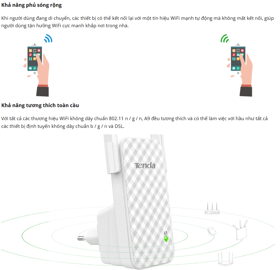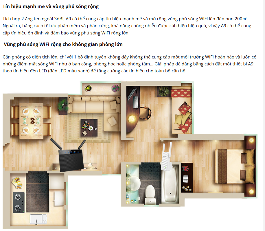 Tenda A9 là sự lựa chọn hoàn hảo để cung cấp tín hiệu mạnh mẽ ở những khu vực sóng yếu nhưng khó khăn trong việc lắp đặt thiết bị Wifi thông thường. Mở rộng vùng