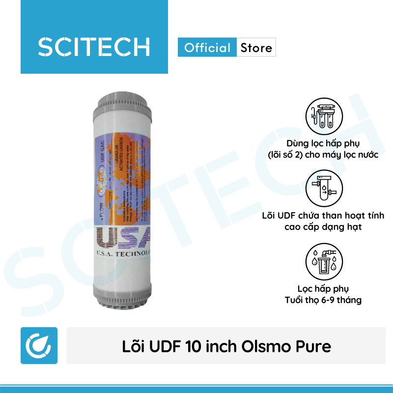 Lõi UDF 10 inch Olsmo Pure xuất xứ Malaysia sử dụng vật liệu than hoạt tính cao cấp dạng hạt với độ xốp cao, có khả năng hấp phụ clo, các dư lượng khí hóa