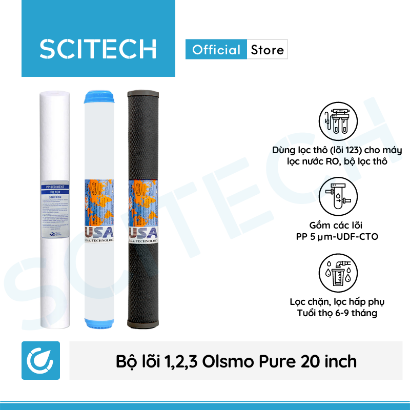 Bộ lõi 1,2,3 Olsmo Pure 20 inch by Scitech dùng cho bộ lọc thô 20 inch và các dòng máy RO công suất lớn (máy lọc nước RO 30 L/H, 50 L/H, 100 L/H) dùng 3 lõi lọc thô trong 3 cốc lọc 20 inch trên thị trường.