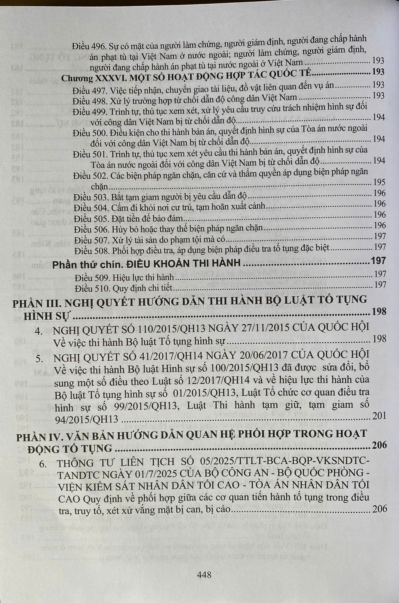 Cuốn sách gồm 9 phần, 510 điều, quy định trình tự, thủ tục tiếp nhận, giải quyết nguồn tin về tội phạm, khởi tố, điều tra, truy tố, xét xử và một số thủ tục