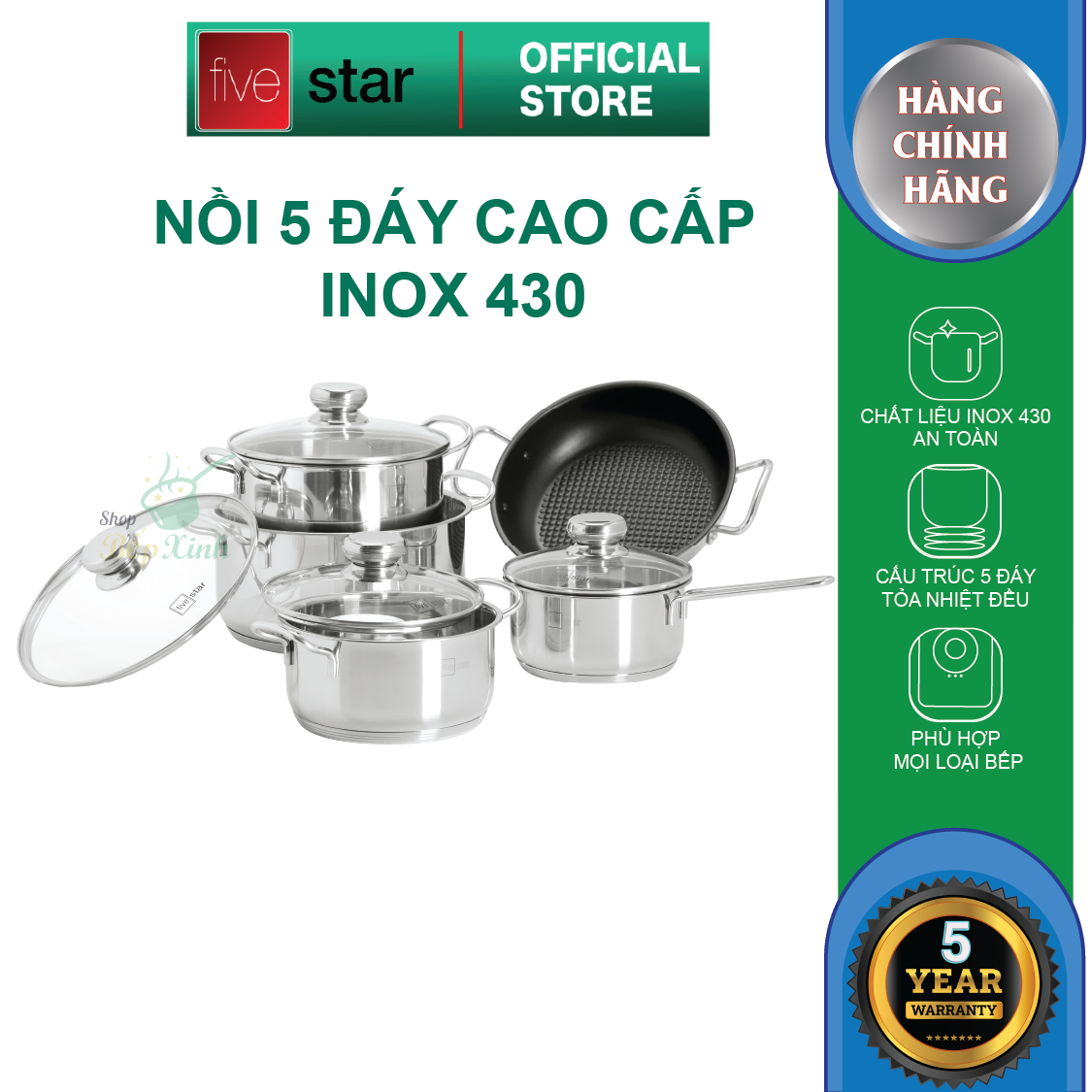 ✨Bộ Nồi 5 Đáy Cao Cấp Bếp Từ Fivestar FSB55D001 Nắp Kính Inox 430 ( 1 quánh16cm x N18cm x N20cm x N24cm x C 24cm ) , tặng 1 vá canh