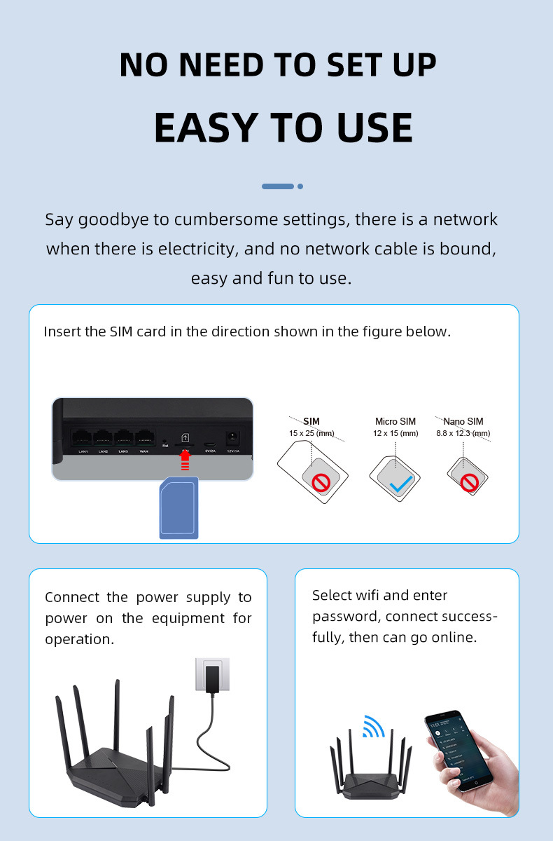 Giao tiếp 1 × 10/100 Mbps LAN/WAN Port; 1 × 10/100 Mbps LAN Port; 1 × 2FF SIM Card Slot Tốc độ Tốc độ Wifi: 2.4GHz:300Mbps; 5.8GHz:867Mbps/ Tốc độ 4G: DL:150Mbps UL:50Mbps Dải tần số