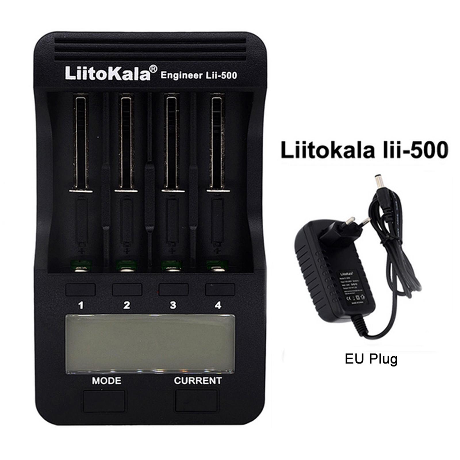 - With a standard 5V/1000 mA USB output function, a 1-cell lithium battery to 4-cell lithium battery completes the USB output, but the Ni-MH battery cannot carry USB output. Specifications: Brand Name: LiitoKala Model Number: Lii-500 Input Voltage: DC 12V/2.0A Lithium battery charging current: 4.2V 300mA/500mA/700mA/1000mA Ni-MH battery charge current: 1.48V 300mA/500mA/700mA/1000mA Discharge Current: 250mA, 500mA USB Output: 5V/1A Compatible with: 3.7V Li-ion Battery including: 26650, 22650, 18650, 18490, 17670, 17500, 17355, 16340, 14500, 10440 Ni-MH/Ni-Cd: AA, AAA, A, SC Color: Black Main Item Size: approx. 15.9 9.3 3.7cm / 6.25 3.66 1.45in Main Item Weight: approx. 210g / 7.40oz Main Package Size: approx. 17.5 17.4 5.2cm / 6.88 6.88 2.04in Main Package Weight: approx. 412g / 14.53oz Package List: 1 Battery Charger 1 Power Adapter 1 * User Manual (English Chinese)