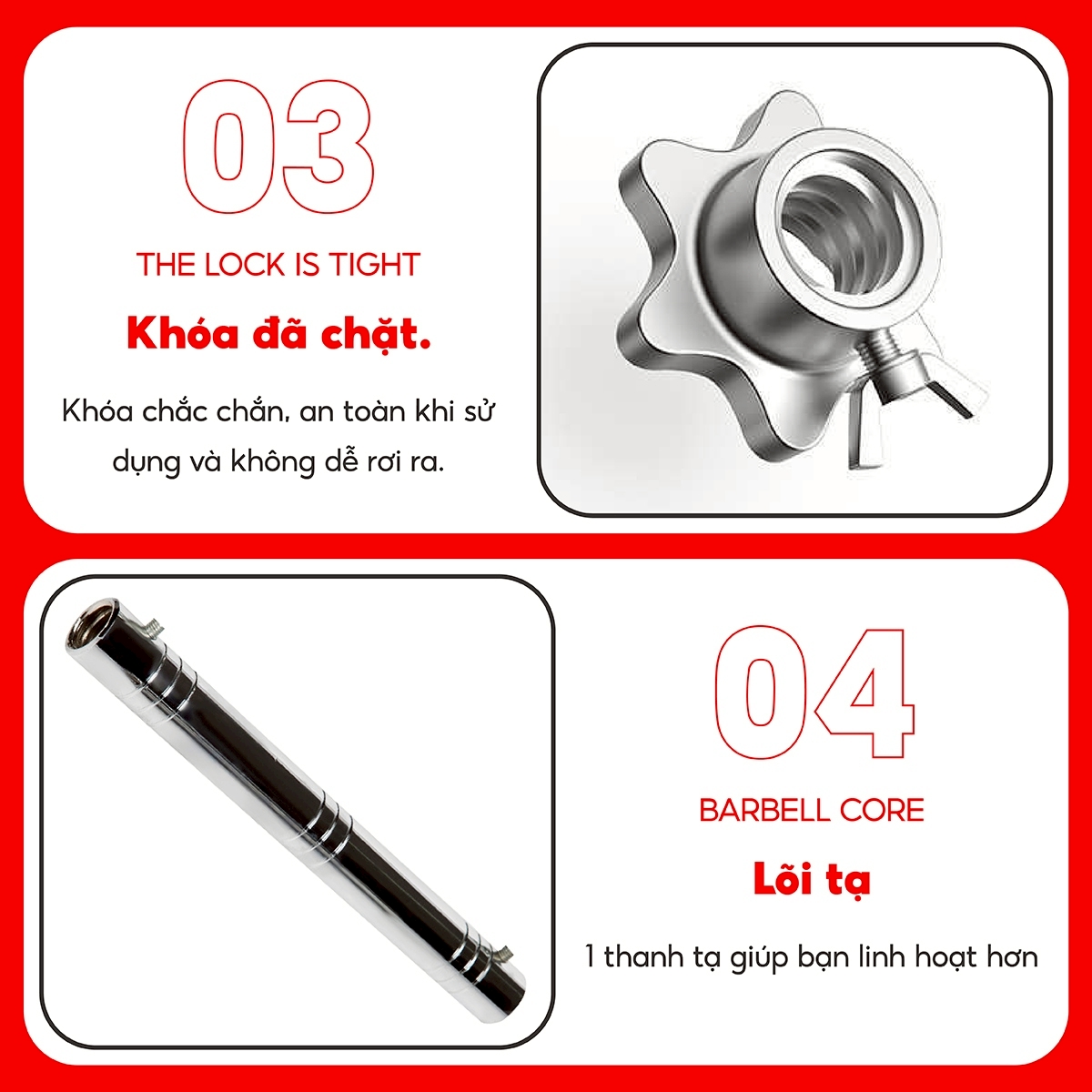 Đòn tạ tay của bộ tạ đa năng tháo lắp cũng được thiết kế dài hơn lên tới úp người tập dễ dàng thực hiện các bài tập tạ đẩy và spuats tiện lợi hơn.