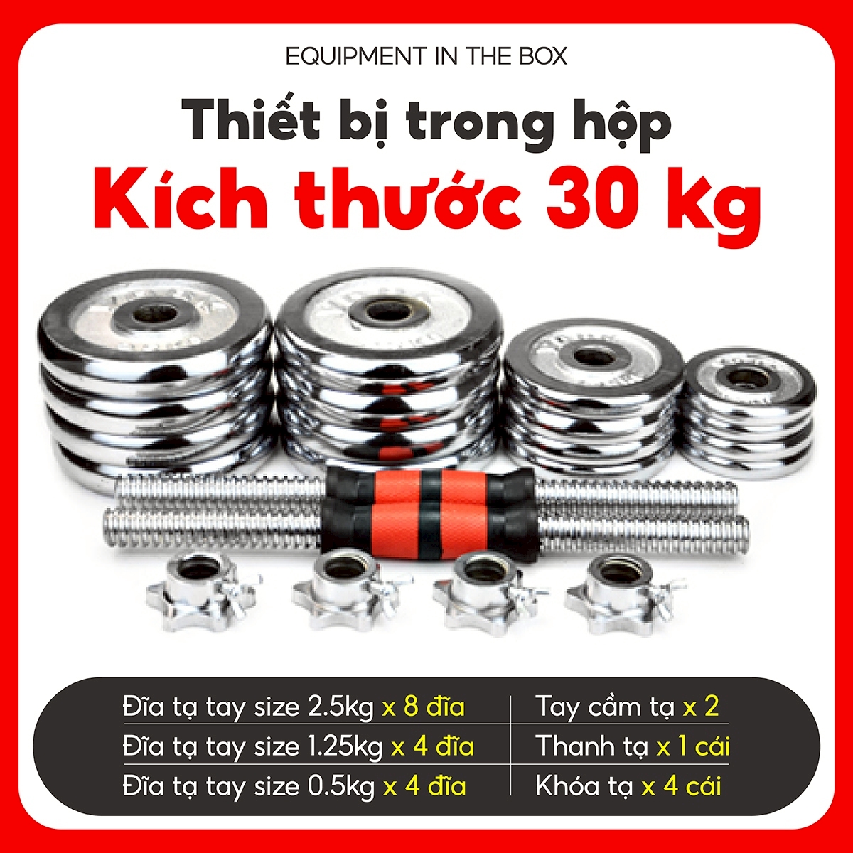 - Bộ tạ tay đa năng 30kg bao gồm: Bánh tạ: 3.5kg - 4 miếng,2.5kg - 4 miếng,1.25kg - 4 miếng.