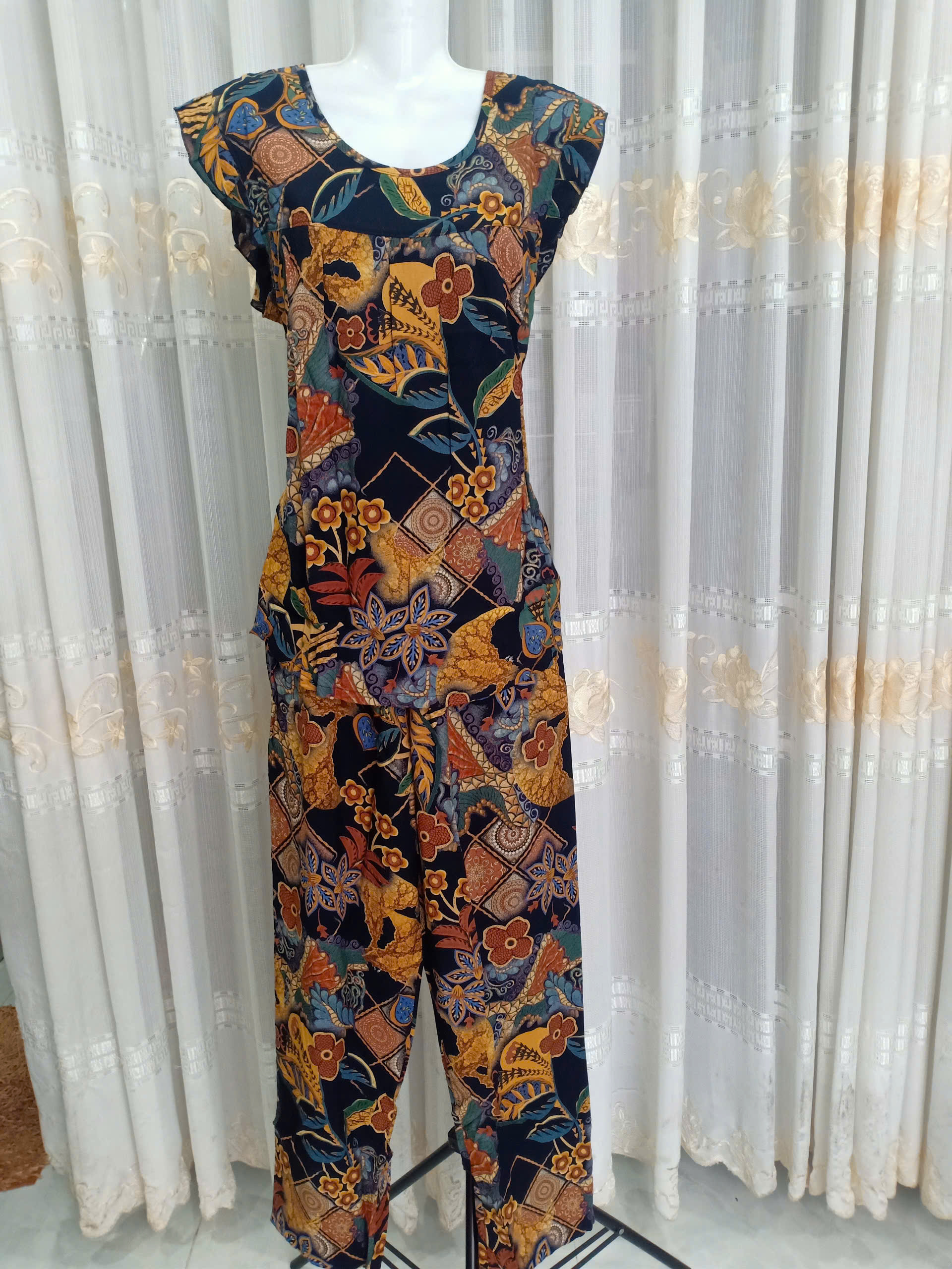 Đặc điểm nổi bật: - Cổ lá sen, tay lỡ - Kẹp ren trắng ở phần lá cổ, lai tay, lai quần - Chất liệu thun - Dáng bộ đồ dài - Thiết kế và