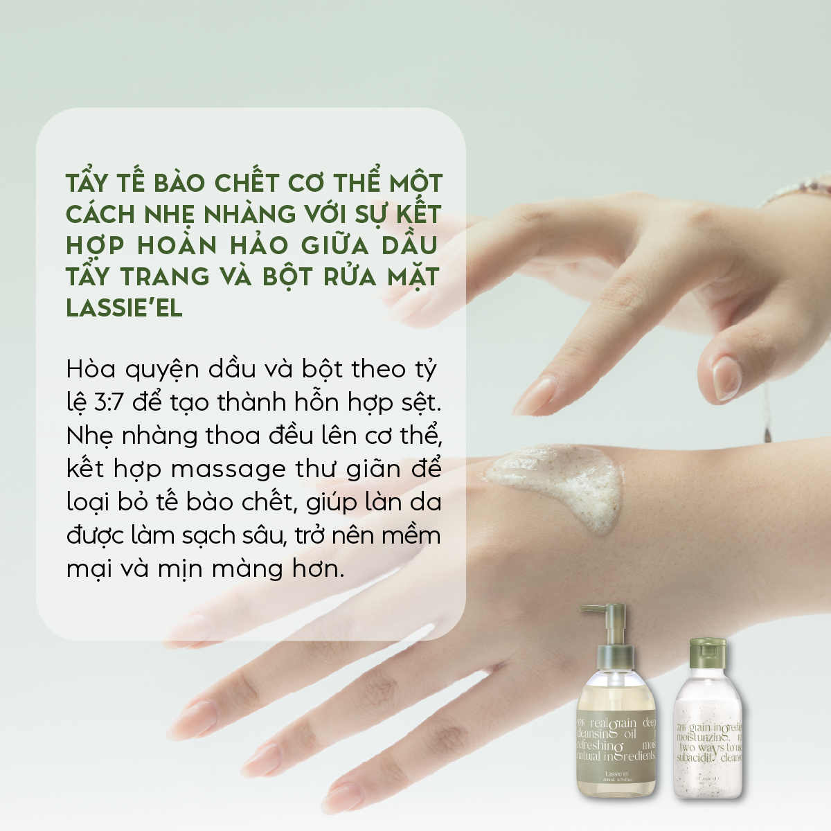 Bộ travel kit 3 sản phẩm làm sạch da Lassie'el chiết xuất từ thiên nhiên sạch sâu sáng da dưỡng ẩm Bộ travel kit 3 sản phẩm làm sạch da Lassie'el được nghiên cứu và sản xuất theo công nghệ Hàn Quốc, thành phần thuần chay, được chọn lọc từ các loại ngũ cốc chiết xuất từ thiên nhiên kết hợp cùng đa dạng dưỡng chất thiết yếu. Bộ sản phẩm tiện lợi giúp bạn dễ dàng làm sạch sâu lớp bụi bẩn, bã nhờn, cặn trang điểm làm thông thoán lỗ chân lông, giảm mụn hiệu quả. Thiết kế nhỏ gọn tiện lợi khi mang đi xa. ❍ THÔNG TIN MÔ TẢ SẢN PHẨM: Ⓛ TRỌN BỘ TRAVEL KIT 3 SẢN PHẨM BAO GỒM ● 1 dầu tẩy trang Lassie'el chiết xuất từ thiên nhiên làm sạch sâu lành tính dưỡng ẩm ngăn ngừa lão hóa 20ml Hàn Quốc. ● 1 bột rửa mặt và tẩy tế bào chết hằng ngày enzyme Lassie'el chiết xuất từ thiên nhiên sáng da không kích ứng 10g Hàn Quốc. ● 1 thanh tẩy tế bào chết đa năng Lassie'el chiết xuất từ thiên nhiên làm sạch sâu cấp dưỡng chất cho body 28g Hàn Quốc. ● 1 túi lưới Ⓛ CÔNG DỤNG CHÍNH ● Dầu tẩy trang Lassie'el: Nhũ hóa nhanh, sạch sâu, giảm mụn đầu trắng, đầu đen. ● Bột rửa mặt và tẩy tế bào chết hằng ngày enzyme Lassie'el: Làm sạch sâu, ẩm mịn, lành tính. ● Thanh tẩy tế bào chết đa năng Lassie'el: Làm sạch sâu, tẩy tế bào chết body, cấp dưỡng chất mang lại làn da ẩm mịn. Ⓛ THÀNH PHẨN CHÍNH ● Ngũ cốc chiết xuất từ thiên nhiên (lúa mạch, ngô, mầm lúa mì, yến mạch, cám gạo, ý dĩ, đậu xanh): giúp làm sạch, dưỡng ẩm, dưỡng trắng sáng da tự nhiên, dưỡng ẩm, lành tính. ● Dầu thực vật (dầu hạt jojoba, dầu hạt hoa trà): giúp làm sạch sâu, giữ ẩm, không gây khô da. ● Dưỡng chất: Ⓛ THÀNH PHẦN CHI TIẾT Vui lòng xem trên bao bì sản phẩm. Ⓛ KẾT CẤU SẢN PHẨM Dạng bột, dầu, rắn Ⓛ CHỈ ĐỊNH SỬ DỤNG: ● Dùng được cho mọi loại da kể cả da nhạy cảm. ● Không gây kích ứng (đã qua kiểm định). Ghi chú: Sử dụng hằng ngày Ⓛ HƯỚNG DẪN BẢO QUẢN Nhiệt độ phòng, tránh tiếp xúc trực tiếp với ánh nắng mặt trời. Ⓛ XUẤT XỨ     : HÀN QUỐC Ⓛ DUNG TÍCH : Ⓛ HSD               : 36 tháng kể từ NSX Ⓛ NSX               : Xem trên bao bì ❍ THÔNG TIN THƯƠNG HIỆU: Thương hiệu Lassie'el lần đầu tiên ra mắt vào năm 2015. Hiện sản phẩm đã được phân phối rộng rãi tại các chuỗi hệ thống Hàn Quốc Olive Young và đang dần mở rộng ra thị trường Quốc Tế như Việt Nam. Bằng những chuyển động thầm lặng nhưng vô cùng nghiêm túc cùng với sự biết ơn những nguyên liệu thô có được từ thiên nhiên, Lassie’el đã tạo nên những sản phẩm mà ngay từ lần đầu sử dụng, làn da của bạn sẽ cảm nhận rõ ràng sự thanh lọc và chữa lành. Chọn Lassie’el chọn an tâm và thầm lặng khởi đầu cho sự chung sống hài hòa giữa con người và thiên nhiên. Lassie’el xin chân thành cảm ơn bạn đã quan tâm đến sản phẩm: Bộ travel kit 3 sản phẩm làm sạch da Lassie'el chiết xuất từ thiên nhiên sạch sâu sáng da dưỡng ẩm