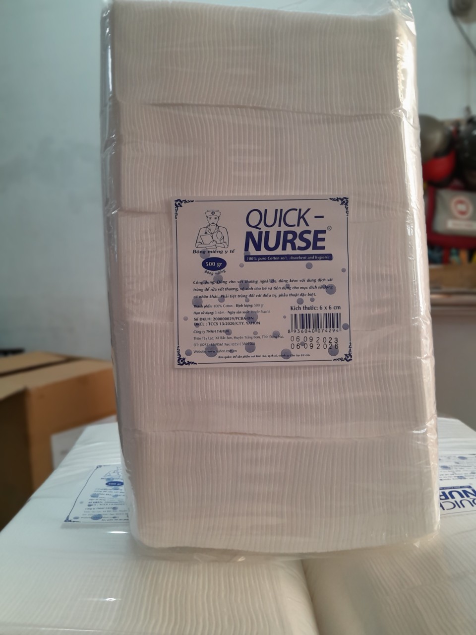 BÔNG CẮT QUICK-NURSE 6CM*6CM - 500GR Bông cắt Quick Nurse được sản xuất trên dây chuyền hiện đại, đáp ứng tiêu chuẩn ISO 9001:2015 và chứng chỉ CGMP. Với thành phần 100% cotton, quy cách