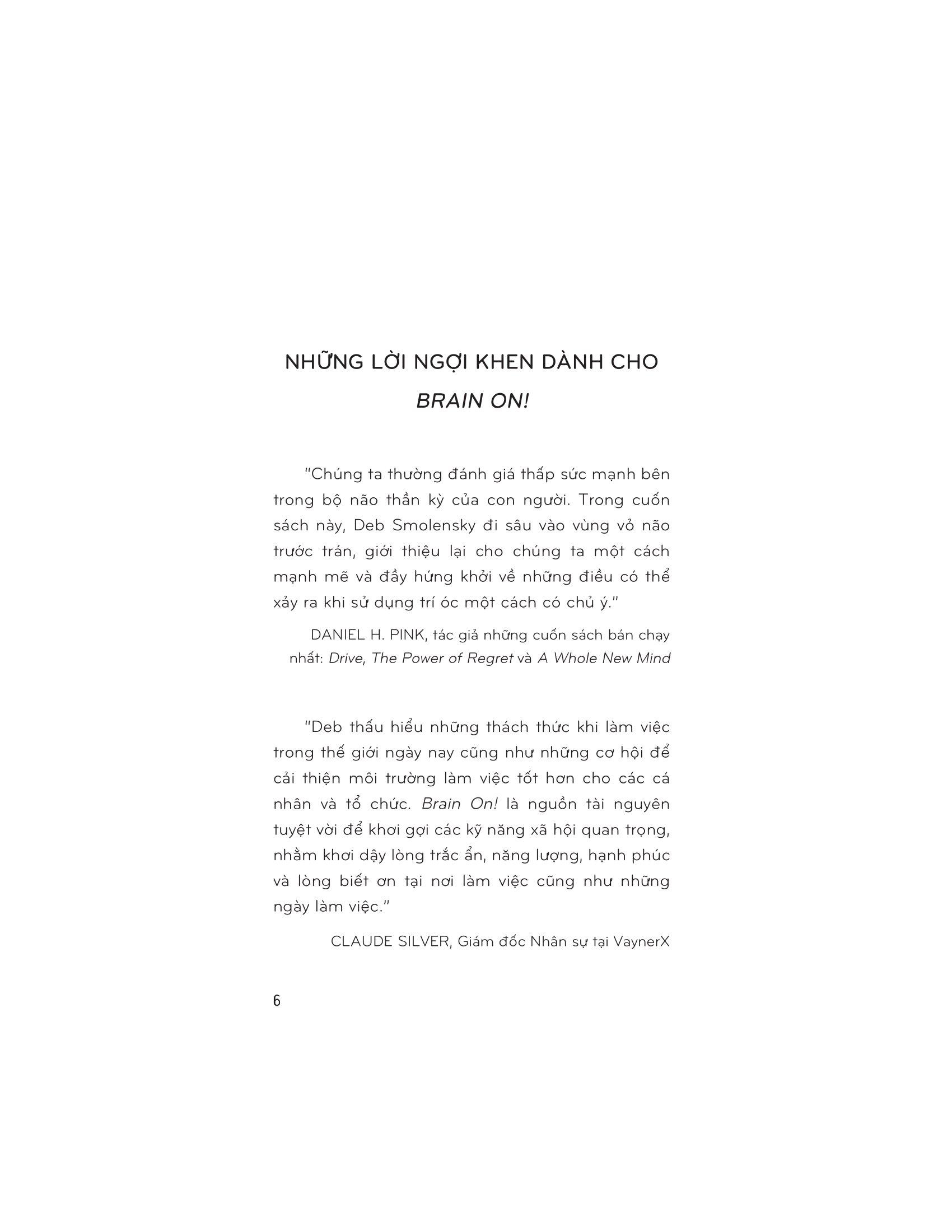 • Phần III: Phương pháp“Kích hoạt Bộ não” dành cho tổ chức, được thiết kế cho các nhà lãnh đạo, bộ phận nhân sự cũng như toàn bộ tổ chức để giúp nhân viên luôn tạo ra một môi trường phát triển mạnh mẽ. Về tác giả: Deb Smolensky là tác giả, diễn giả và nhà lãnh đạo tư tưởng trong lĩnh vực hiệu suất con người và duy trì sức khỏe tại nơi làm việc. Trong 25 năm qua, Deb đã nhận được nhiều chứng nhận về những đóng góp cho năng suất và sức khỏe của tổ chức. Cô tư vấn cho nhiều khách hàng, bao gồm nhiều công ty trong danh sách Fortune 500, để phát triển các chiến lược, chương trình và phương pháp thực hành nhằm tiếp thêm sức mạnh cho nhân viên và đội ngũ điều hành, giúp họ xây dựng cuộc sống lành mạnh, hiệu quả tại nơi làm việc thông qua các giải pháp sáng tạo, giàu ý nghĩa và hấp dẫn. Một số lời khen: “Chúng ta thường đánh giá thấp sức mạnh bên trong bộ não thần kỳ của con người. Trong cuốn sách này, Deb Smolensky đi sâu vào vùng vỏ não trước trán, giới thiệu lại cho chúng ta một cách mạnh mẽ và đầy hứng khởi về những điều có thể xảy ra khi sử dụng trí óc một cách có chủ ý.” DANIEL H. PINK, tác giả những cuốn sách bán chạy nhất: Drive, The Power of Regretvà A Whole New Mind “Deb thấu hiểu những thách thức khi làm việc trong thế giới ngày nay cũng như những cơ hội để cải thiện môi trường làm việc tốt hơn cho các cá nhân và tổ chức. Brain On! là nguồn tài nguyên tuyệt vời để khơi gợi các kỹ năng xã hội quan trọng, nhằm khơi dậy lòng trắc ẩn, năng lượng, hạnh phúc và lòng biết ơn tại nơi làm việc cũng như những ngày làm việc.”