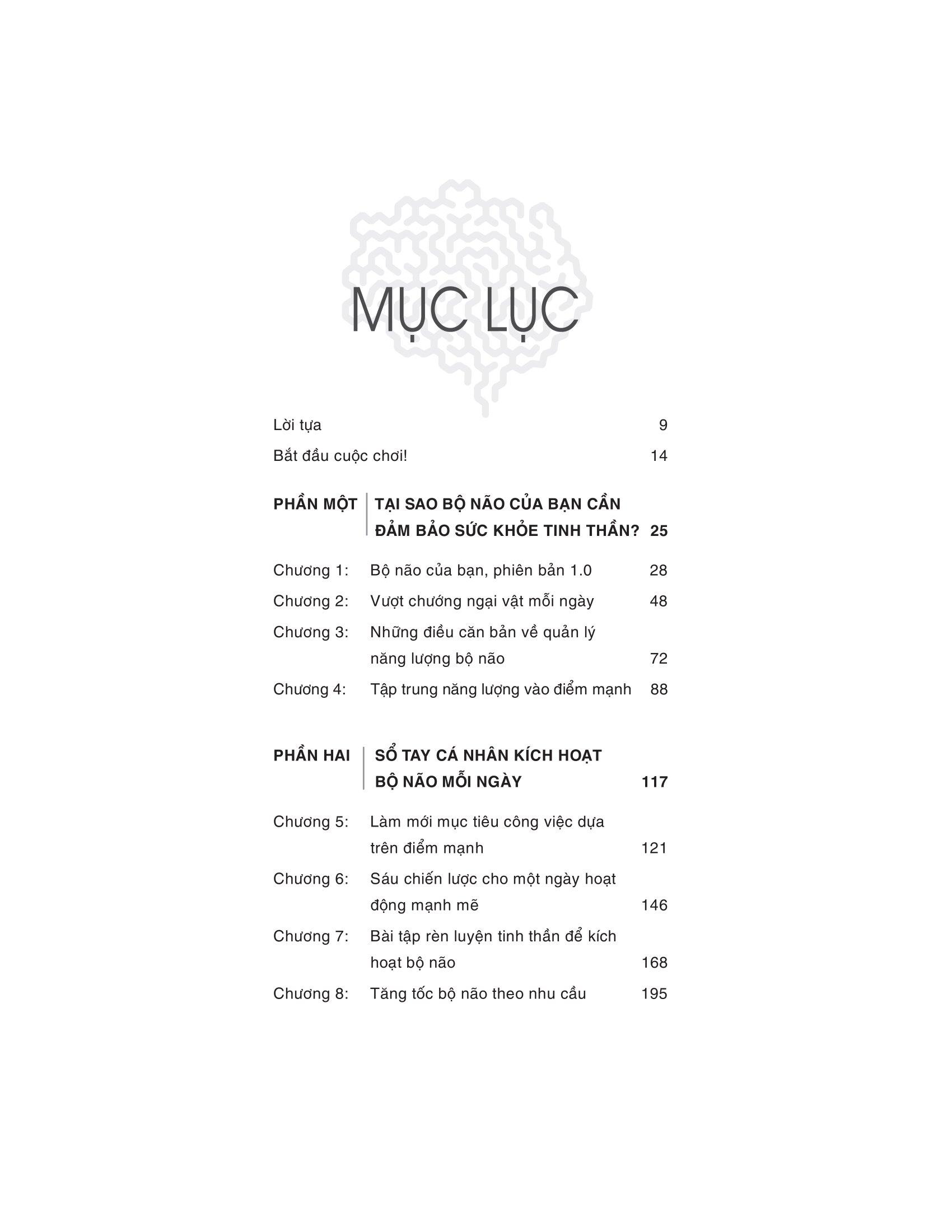 • Phần II: Những cách thức đã được chứng minh để giữ cho bộ não của bạn tập trung và hướng tới mục tiêu đã định. Bạn sẽ học cách tạo lập lịch trình rèn luyện tinh thần của riêng m.ình để luyện tập trí não, sử dụng các kỹ thuật và thói quen hiệu quả nhằm vượt qua những trở ngại trong công việc.
