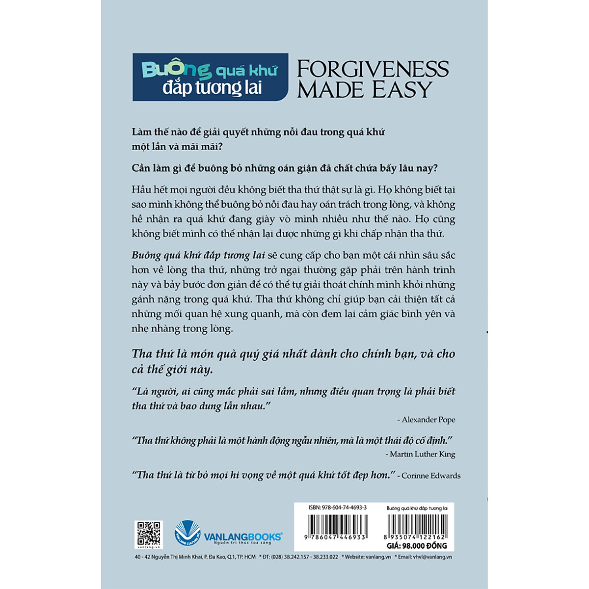 Làm thế nào để giải quyết những nỗi đau trong quá khứ một lần và mãi mãi? Cần làm gì để buông bỏ những oán giận đã chất chứa bấy lâu nay? Hầu hết mọi người đều không biết tha thứ thật sự là gì. Họ không biết tại sao mình không thể buông bỏ nỗi đau hay oán trách trong lòng, và không hề nhận ra quá khứ đang giày vò mình nhiều như thế nào. Họ cũng không biết mình có thể nhận lại được những gì khi chấp nhận tha thứ. Buông quá khứ đắp tương lai sẽ cung cấp cho bạn một cái nhìn sâu sắc hơn về lòng tha thứ, những trở ngại thường gặp phải trên hành trình này và bảy bước đơn giản để có thể tự giải thoát chính mình khỏi những gánh nặng trong quá khứ. Tha thứ không chỉ giúp bạn cải thiện tất cả những mối quan hệ xung quanh, mà còn đem lại cảm giác bình yên và nhẹ nhàng trong lòng. Tha thứ là món quà quý giá nhất dành cho chính bạn, và cho cả thế giới này. “Là người, ai cũng mắc phải sai lầm, nhưng điều quan trọng là phải biết tha thứ và bao dung lẫn nhau.” - Alexander Pope “Tha thứ không phải là một hành động ngẫu nhiên, mà là một thái độ cố định.” - Martin Luther King “Tha thứ là từ bỏ mọi hi vọng về một quá khứ tốt đẹp hơn.” - Corinne Edwards     Mã hàng 8935074122162 Tên Nhà Cung Cấp Tác giả Barbara J Hunt Người Dịch Huyền Trâm NXB NXB Thanh Hóa Năm XB 2020 Trọng lượng (gr) 250 Kích Thước Bao Bì 24 x 16 cm Số trang 200 Hình thức Bìa Mềm Sản phẩm bán chạy nhất Giá sản phẩm trên F đã bao gồm thuế theo luật hiện hành. Bên cạnh đó, tuỳ vào loại sản phẩm, hình thức và địa chỉ giao hàng mà có thể phát sinh thêm chi phí khác như Phụ phí đóng gói, phí vận chuyển, phụ phí hàng cồng kềnh,   Làm thế nào để giải quyết những nỗi đau trong quá khứ một lần và mãi mãi? Cần làm gì để buông bỏ những oán giận đã chất chứa bấy lâu nay? Hầu hết mọi người đều không biết tha thứ thật sự là gì. Họ không biết tại sao mình không thể buông bỏ nỗi đau hay oán trách trong lòng, và không hề nhận ra quá khứ đang giày vò mình nhiều như thế nào. Họ cũng không biết mình có thể nhận lại được những gì khi chấp nhận tha thứ. Buông quá khứ đắp tương lai sẽ cung cấp cho bạn một cái nhìn sâu sắc hơn về lòng tha thứ, những trở ngại thường gặp phải trên hành trình này và bảy bước đơn giản để có thể tự giải thoát chính mình khỏi những gánh nặng trong quá khứ. Tha thứ không chỉ giúp bạn cải thiện tất cả những mối quan hệ xung quanh, mà còn đem lại cảm giác bình yên và nhẹ nhàng trong lòng. Tha thứ là món quà quý giá nhất dành cho chính bạn, và cho cả thế giới này. “Là người, ai cũng mắc phải sai lầm, nhưng điều quan trọng là phải biết tha thứ và bao dung lẫn nhau.” - Alexander Pope “Tha thứ không phải là một hành động ngẫu nhiên, mà là một thái độ cố định.” - Martin Luther King “Tha thứ là từ bỏ mọi hi vọng về một quá khứ tốt đẹp hơn.” - Corinne Edwards